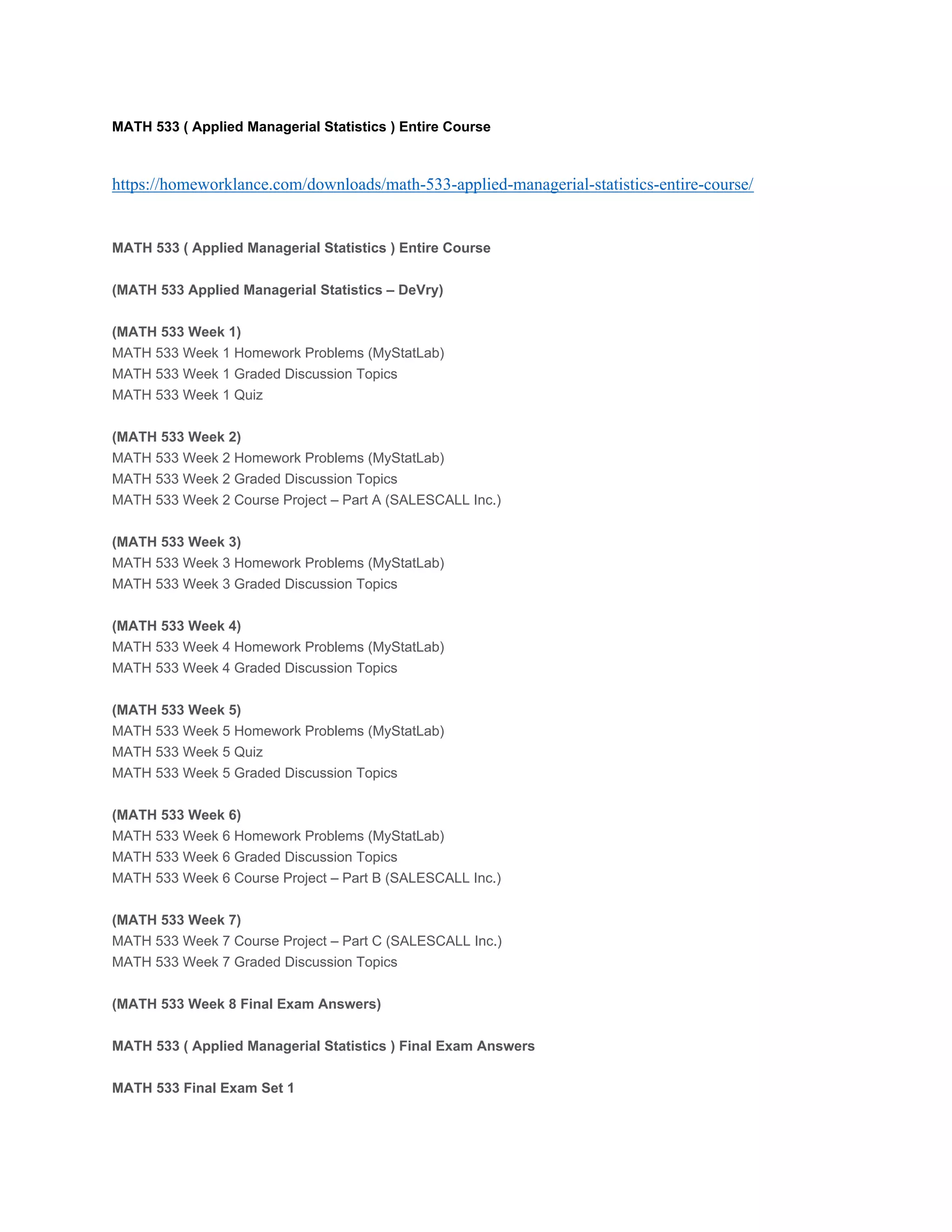 This document contains materials for the MATH 533 Applied Managerial Statistics course, including homework problems, discussion topics, quizzes, exams, and a course project for each of the 8 weeks. It provides all the necessary materials to complete the entire course, with separate sections for each week that include the associated assignments, assessments, and deliverables.