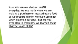 The document discusses how early learners begin to develop foundational math skills like counting, shapes, and time through exploring their world and everyday materials. It emphasizes that early math learning should be integrated into play and other activities rather than isolated skill-building. Some key early math skills mentioned include understanding size, shape, patterns, counting, recognizing numbers, and comparing quantities. The document stresses the importance of facilitating early learners' development through providing accessible, culturally-inclusive materials and making real-world connections to topics.