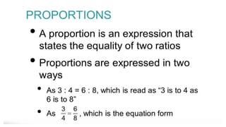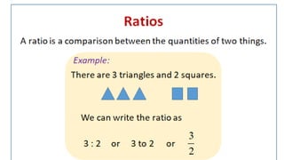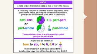 1) The document discusses reducing ratios to their lowest terms. It provides examples of reducing fractions such as 2/4 to 1/2 and ratios such as 15:30 to 5:10.