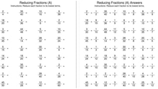 2) Students are asked to reduce given ratios and fractions to their simplest form. This involves dividing the ratios by their greatest common factor until they can no longer be simplified.