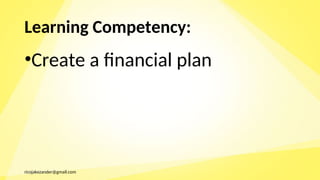 The document outlines the key components of financial planning, including budgeting, investing, retirement planning, estate planning, and risk management. It emphasizes the importance of assessing one's financial health, setting clear goals, and considering factors such as family structure, health, career choice, and age in the planning process. Additionally, it discusses how external economic indicators like the business cycle and employment rates can influence financial planning decisions.