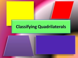 This document provides information about classifying triangles according to their sides and angles. It discusses scalene, isosceles, equilateral, acute, right, and obtuse triangles. Examples of classifying triangles based on their properties are provided. Students are instructed to draw triangles with given side or angle measures and classify triangles they draw on their own. The document also covers properties of quadrilaterals such as parallelograms, rectangles, rhombuses, squares, and trapezoids.