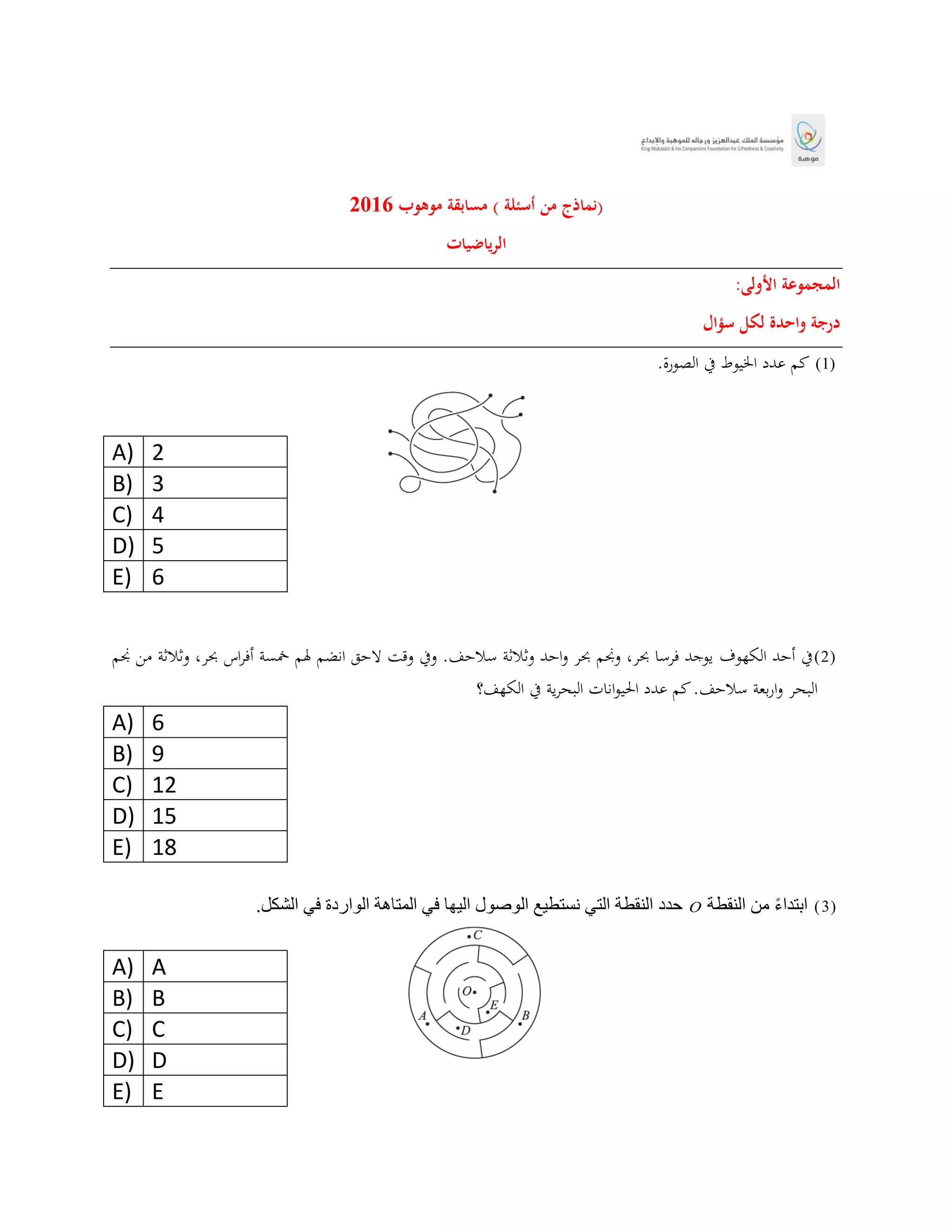 هذه الوثيقة تحتوي على مجموعة من الأسئلة الرياضية المتعلقة بمسابقة للمواهب، حيث تتضمن أسئلة تتعلق بالمجموعات المختلفة والأرقام. يتضمن كل مجموعة عددًا معينًا من الأسئلة مع خيارات متعددة للإجابة. المسابقة تهدف لتقييم المعرفة الرياضية لدى المشاركين.