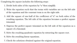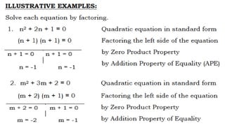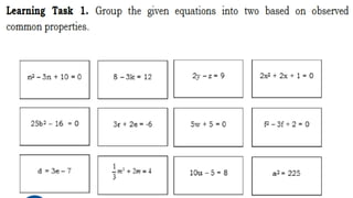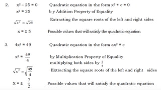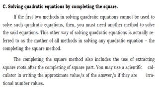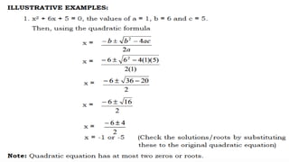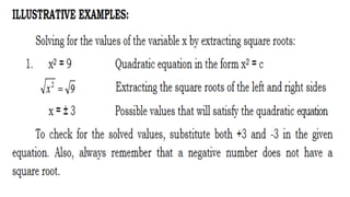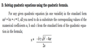 This document outlines the rules, objectives, and structure for a 9th grade mathematics class on quadratic equations taught by Larry B. Azarias. The class rules instruct students to keep the classroom clean and avoid unnecessary noise. By the end of the lesson, students are expected to illustrate and solve quadratic equations using various methods, and actively participate in discussions. The lesson will include introductions, concepts, activities, and applications related to quadratic equations, followed by student reflections.