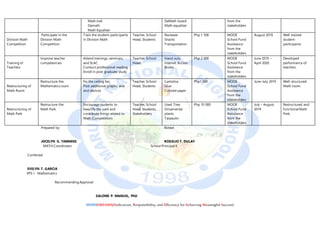 This document outlines an action plan for mathematics at Maruhat National High School for the 2019-2020 school year. The plan includes administering pre-tests, quarterly tests, and post-tests to assess student performance; using differentiated instruction techniques to increase performance; conducting drills to reduce the number of non-numerates; organizing a math club; holding a school-based math competition; training student participants for the division math competition; improving teacher competencies through professional development; restructuring the math room and math park; and preparing the plan with input from teachers, administrators, students and stakeholders. The expected outputs are increased student performance, reduced non-numerates, an organized math club, enhanced student skills, well-trained