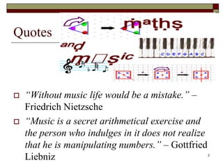 Mathematics and music are deeply linked. Pythagoras first discovered mathematical relationships between string lengths and musical pitches. Since then, theorists have studied proportions and how different frequencies produce different notes. Sound is produced by regular vibrations, with pitch determined by frequency. Overtones above the fundamental frequency give instruments their distinctive timbre. Resonant frequencies are important in acoustics and engineering.