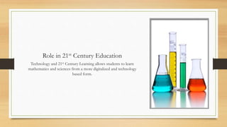 This document discusses the importance of teaching math and science in 21st century education. It argues that technology allows these subjects to be taught in more digital and technology-based ways, through experiments, blogs, videos, and podcasts. For example, one activity described has students measuring ingredients for a chemical reaction and recording a podcast about their findings. The document stresses that math and science are important for careers, everyday life, and developing skills like critical thinking. It concludes that integrating these subjects and hands-on learning provides pathways for students to explore STEM careers.