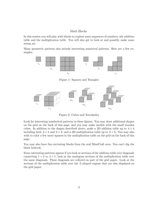This document provides an activity exploring mathematical patterns using blocks. It contains 17 questions for students to explore patterns in addition tables, multiplication tables, squares, cubes, and triangles built with blocks. Some key objectives are to discover algebraic formulas and understand why the product of two negative numbers is positive. The activity is suitable for grades 4-12 and can be done in one or multiple 60-minute sessions using wooden blocks.