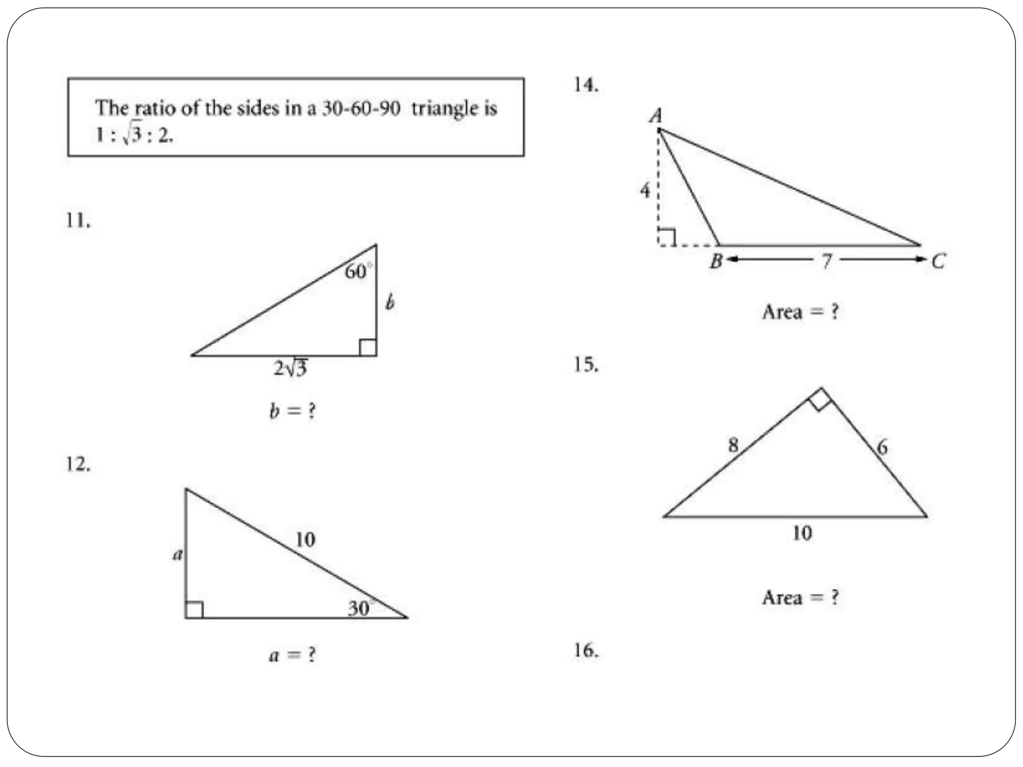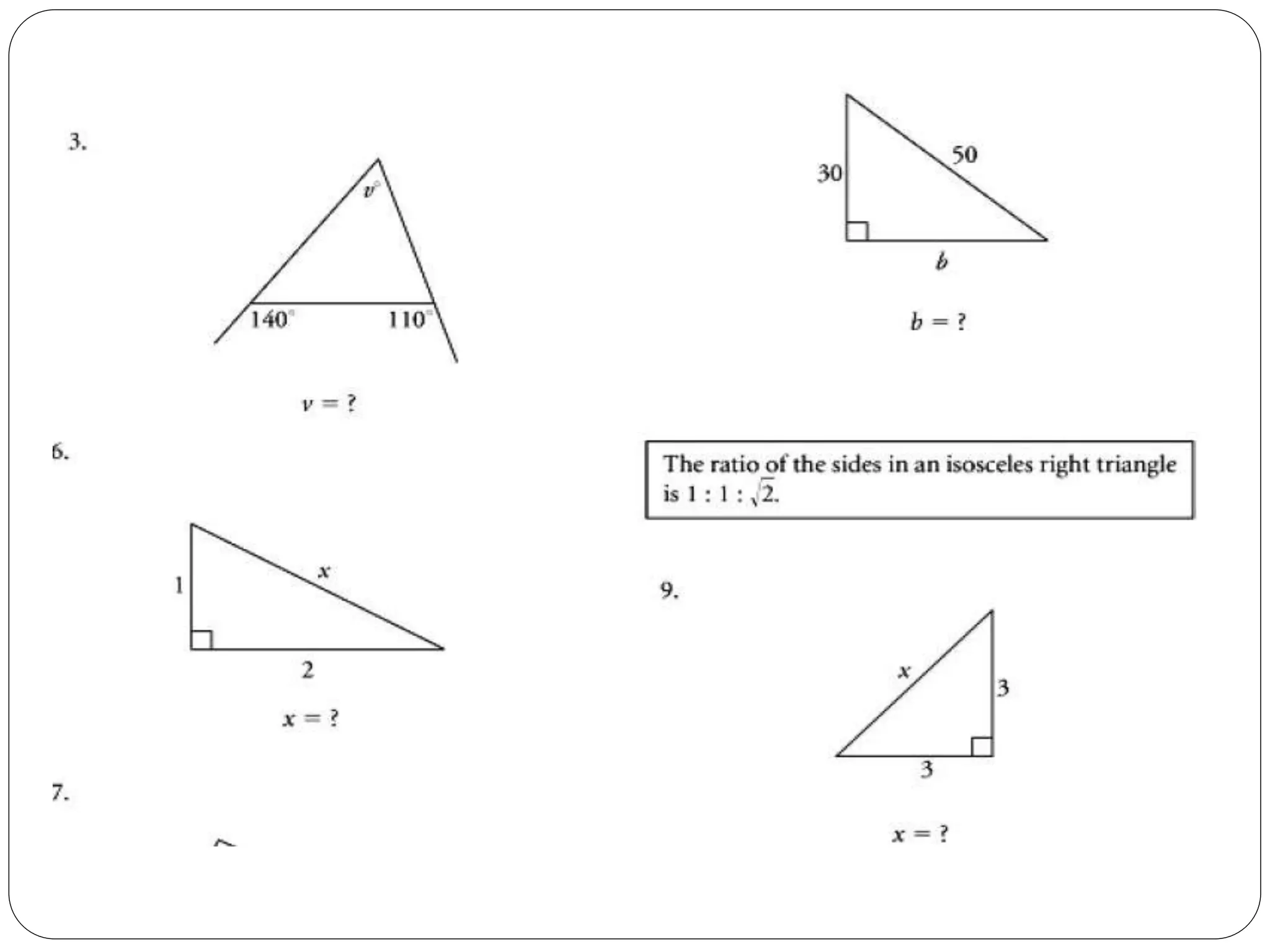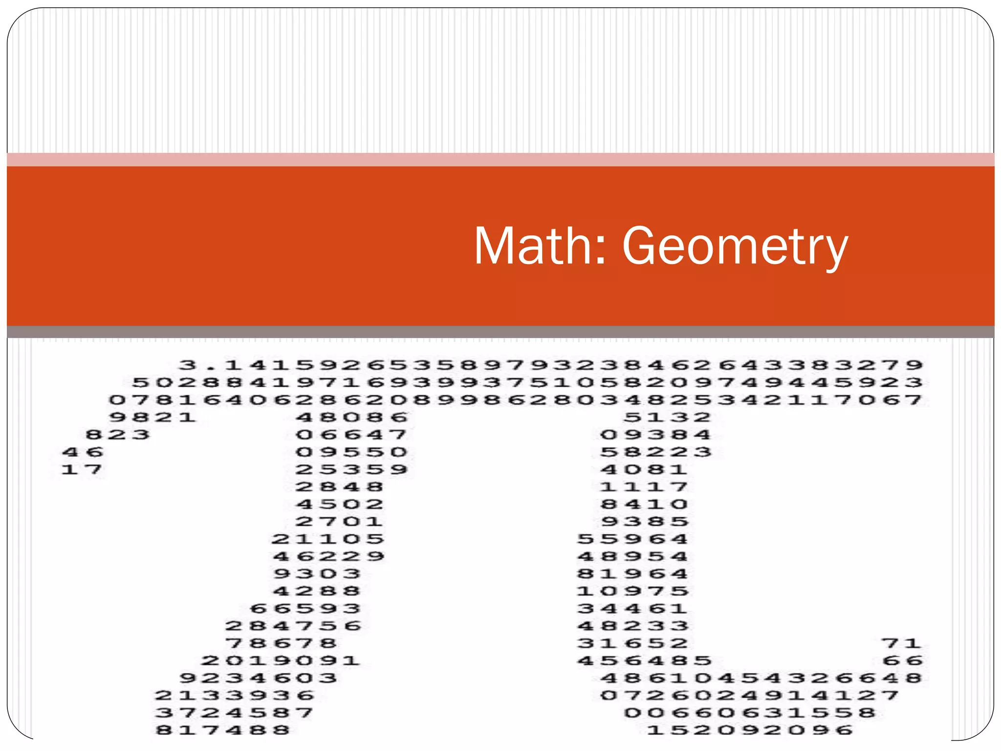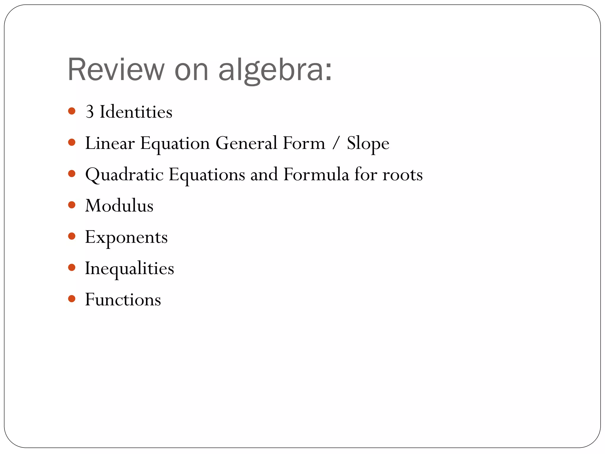 This document provides an agenda for a geometry review session. It begins with a brief review of algebra concepts like identities, linear equations, quadratics, exponents, and inequalities. The bulk of the document then outlines the geometry concepts to be covered, including coordinate geometry, graphing functions, circles, lines and angles, triangles, quadrilaterals, and solids. Circle topics include finding areas and circumferences, as well as sectors. Triangle topics include side and angle properties, the Pythagorean theorem, and special right triangles. Solids problems involve calculating volumes and surface areas.
