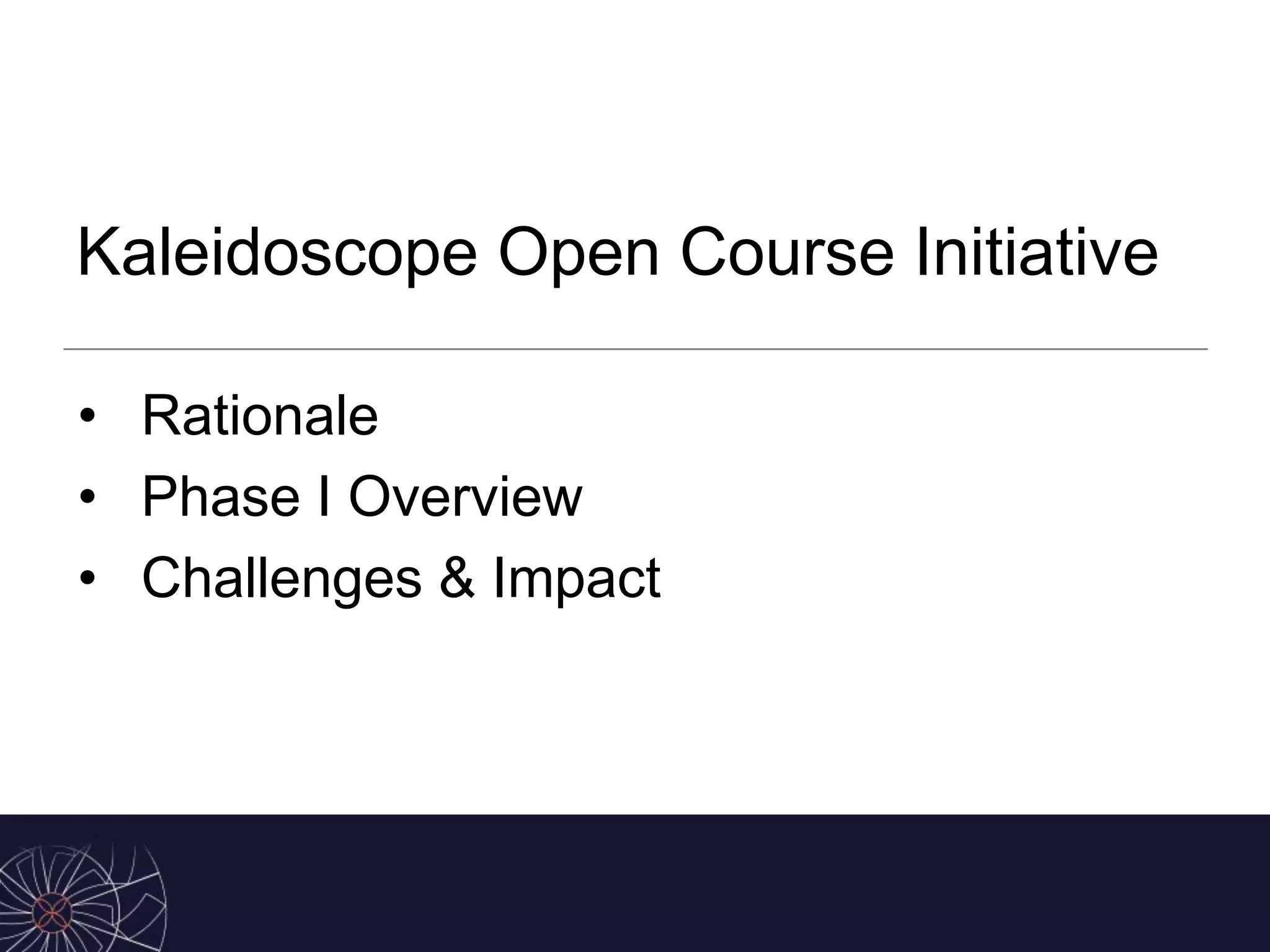 The Kaleidoscope Open Course Initiative aims to improve student success, particularly for low-income and underrepresented students, by creating open educational resource (OER) course designs that can be adopted across institutions. Phase I of the initiative developed 11 OER courses impacting 9,000 students, which improved average student success rates by over 10% while eliminating textbook costs. Student feedback indicated that the OER courses were of equal or better quality than traditional materials and that students preferred the free, digital access provided. Phase II plans to develop additional courses frameworks and grow the number of participating institutions.