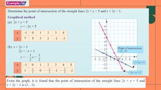 This document provides an overview of determining the point of intersection between two straight lines in a Mathematics Form 3 chapter on straight lines. It outlines two learning objectives: using the substitution method and elimination method to calculate the point of intersection from simultaneous equations. It presents sample problems determining the point of intersection using both methods and instructs students to solve similar problems using an online tool and test their understanding with a quiz.