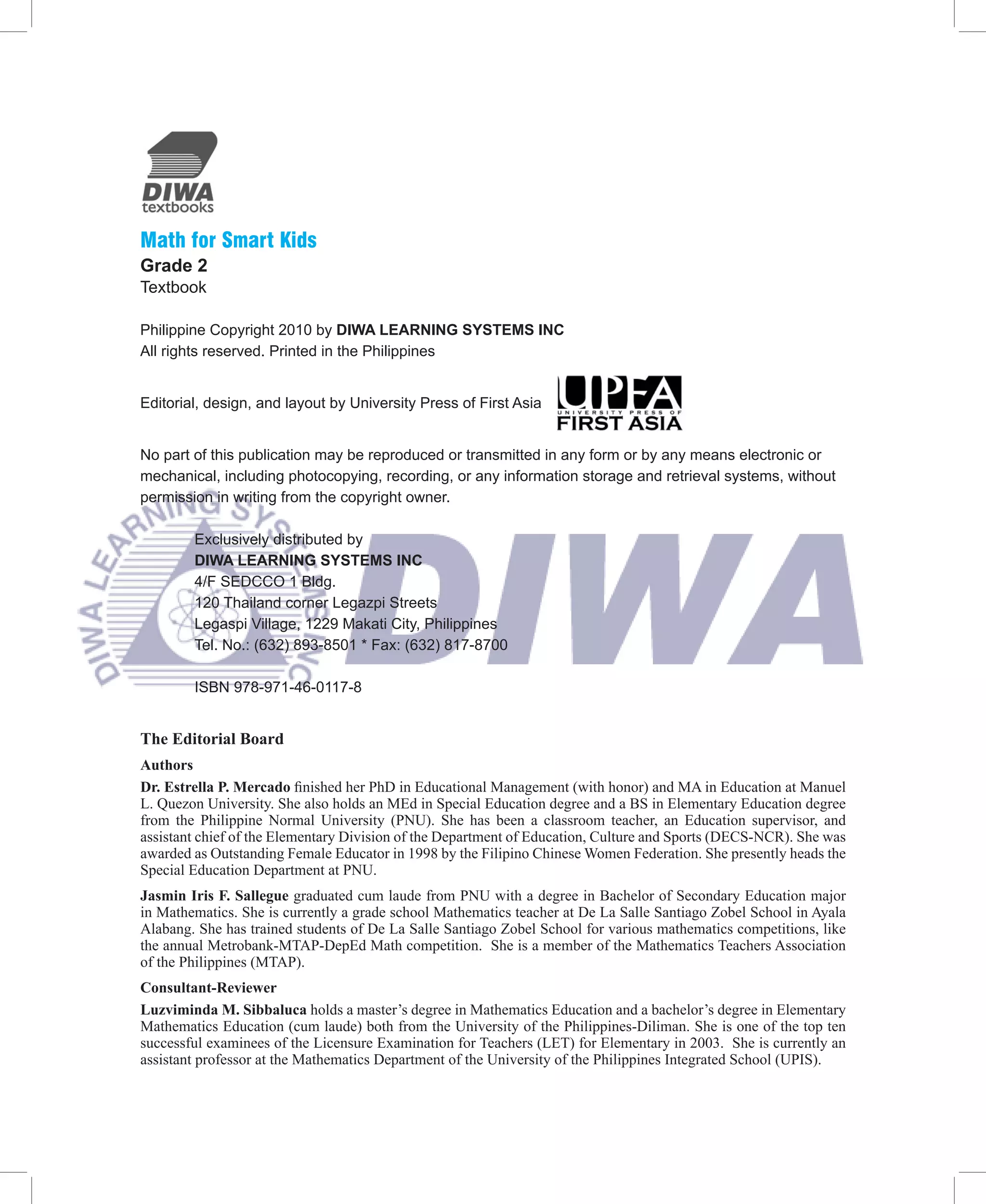The document is a Grade 2 mathematics textbook titled 'Math for Smart Kids,' published by Diwa Learning Systems in 2010. It aims to develop students' appreciation for mathematics through various engaging activities and multilevel exercises, reflecting competencies prescribed by the Department of Education in the Philippines. The curriculum includes topics such as whole numbers, addition, subtraction, multiplication, division, fractions, geometry, measurement, time, and graphs, structured to support critical thinking and practical application.