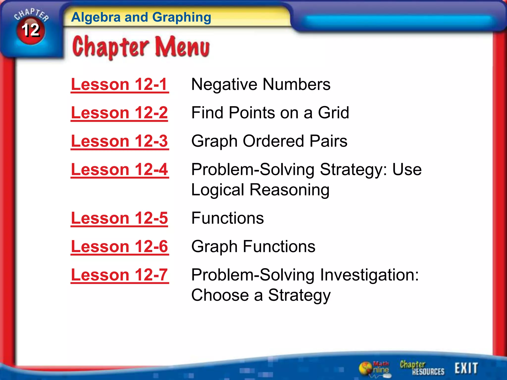 The document is about algebra and graphing. It contains 12 lessons: negative numbers, finding points on a grid, graphing ordered pairs, problem-solving strategies using logical reasoning, functions, and graphing functions. The lessons include examples and practice problems related to these algebra and graphing topics.