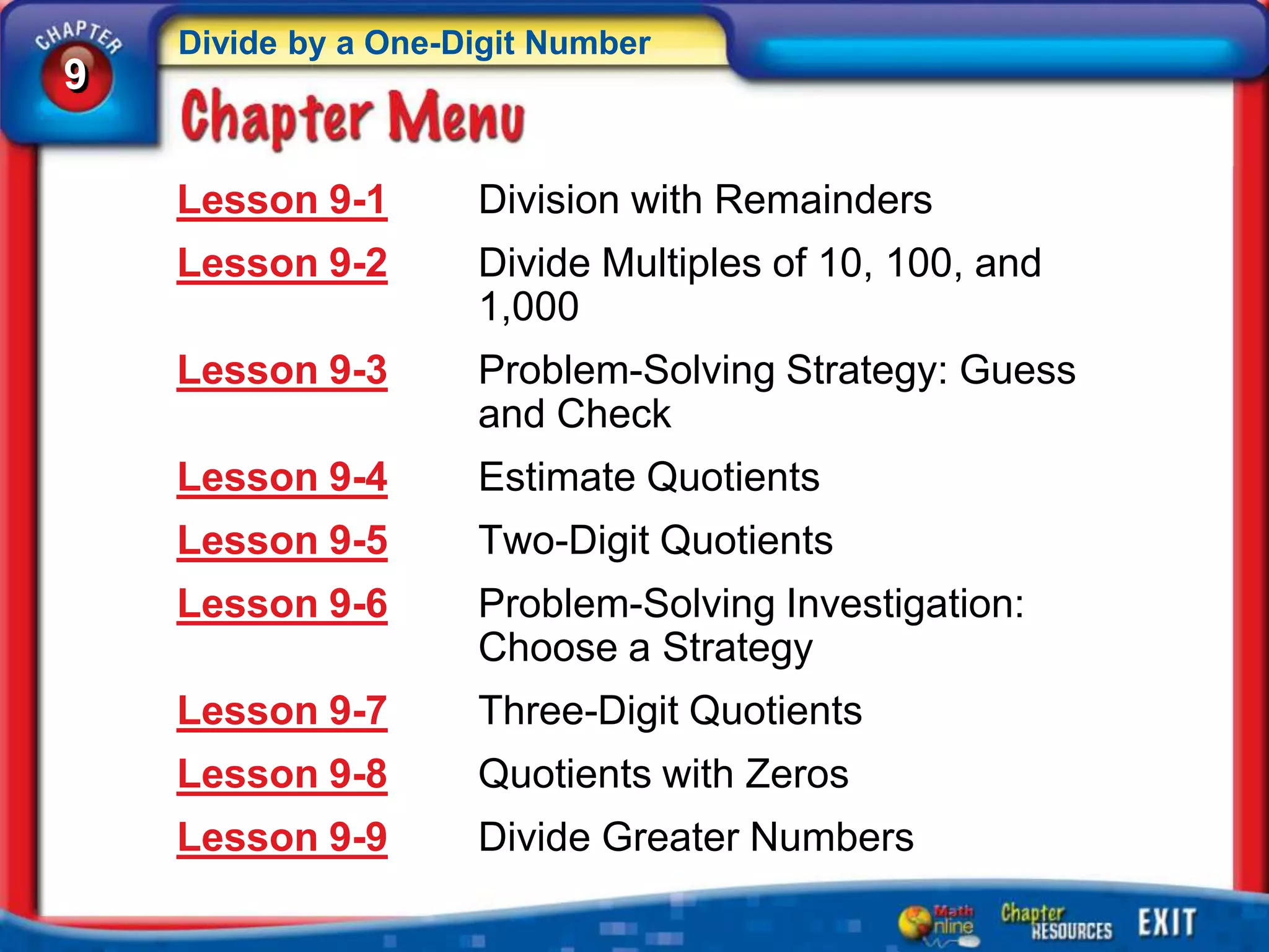 This document outlines lessons on dividing by one-digit numbers. Lesson 9-1 covers division with and without remainders. Lesson 9-2 discusses dividing multiples of 10, 100, and 1,000. Lesson 9-3 introduces the problem-solving strategy of guess and check. Lesson 9-4 is about estimating quotients. Each lesson provides examples and relates the content to California math standards.