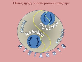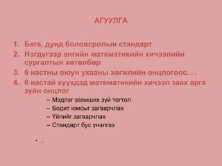АГУУЛГА Бага, дундболовсролын стандарт Нэгдүгээр ангийн математикийн хичээлийн сургалтын хөтөлбөр 6 настны оюун ухааны хөгжлийн онцлогоос. . . 6 настай хүүхдэд математикийн хичээл заах арга зүйн онцлог Мэдлэг эзэмших зүй тогтол Бодит юмсыг загварчлах Үйлийг загварчлах Стандарт бус үнэлгээ .. - 3.