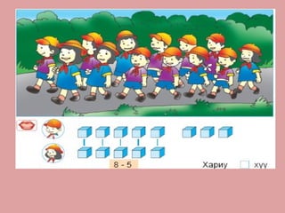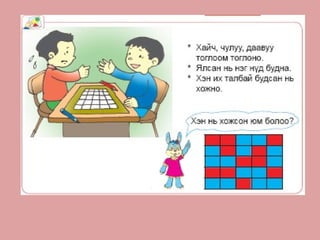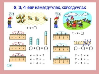 Ñóðàã÷èä I àíãè òºãñºõ人 ìàòåìàòèêèéí õè÷ýýëýýð äàðààõ ÷àäâàðòàé áîëíî. ¯¿íä : Îðîí çàé, öàã õóãàöààíû åðºíõèé òºñººëºëòýé áîëîõ 0 - 100 õ¿ðòýëõ á¿õýë òîîã óíøèæ, áè÷èæ, òîîëæ, òýìäýãëýõ, ýðýìáýëýõ, æèøèõ 20 äîòîð íýìýõ, õàñàõ Öýã, õýð÷èì, ãóðâàëæèí, äºðâºëæèí, äóãóé ä¿ðñèéã ÿëãàí òàíüæ íýðëýõ, çóðàõ ýäãýýðèéã àøèãëàí õÿëáàð çîõèîìæ õèéõ Äàðààëàí áàéðëóóëñàí òîî, þìñ, ¿éë ÿâäëûí ç¿é òîãòëûã àæèãëàí èëð¿¿ëýõ, õÿëáàð òóðøèëò õèéõ, ¿ð ä¿íã á¿ðòãýõ, àæèãëàõ, ä¿ãíýõ - 7.