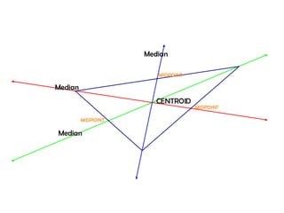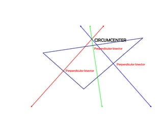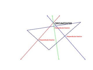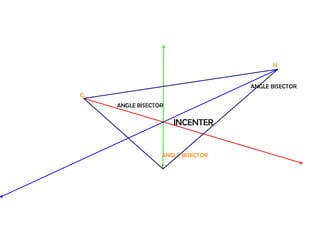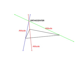 The orthocenter is the point where the altitudes of a triangle meet. The incenter is where the angle bisectors intersect. The circumcenter is the point where the perpendicular bisectors of the sides concur. The centroid is the meeting point of the triangle's three medians.