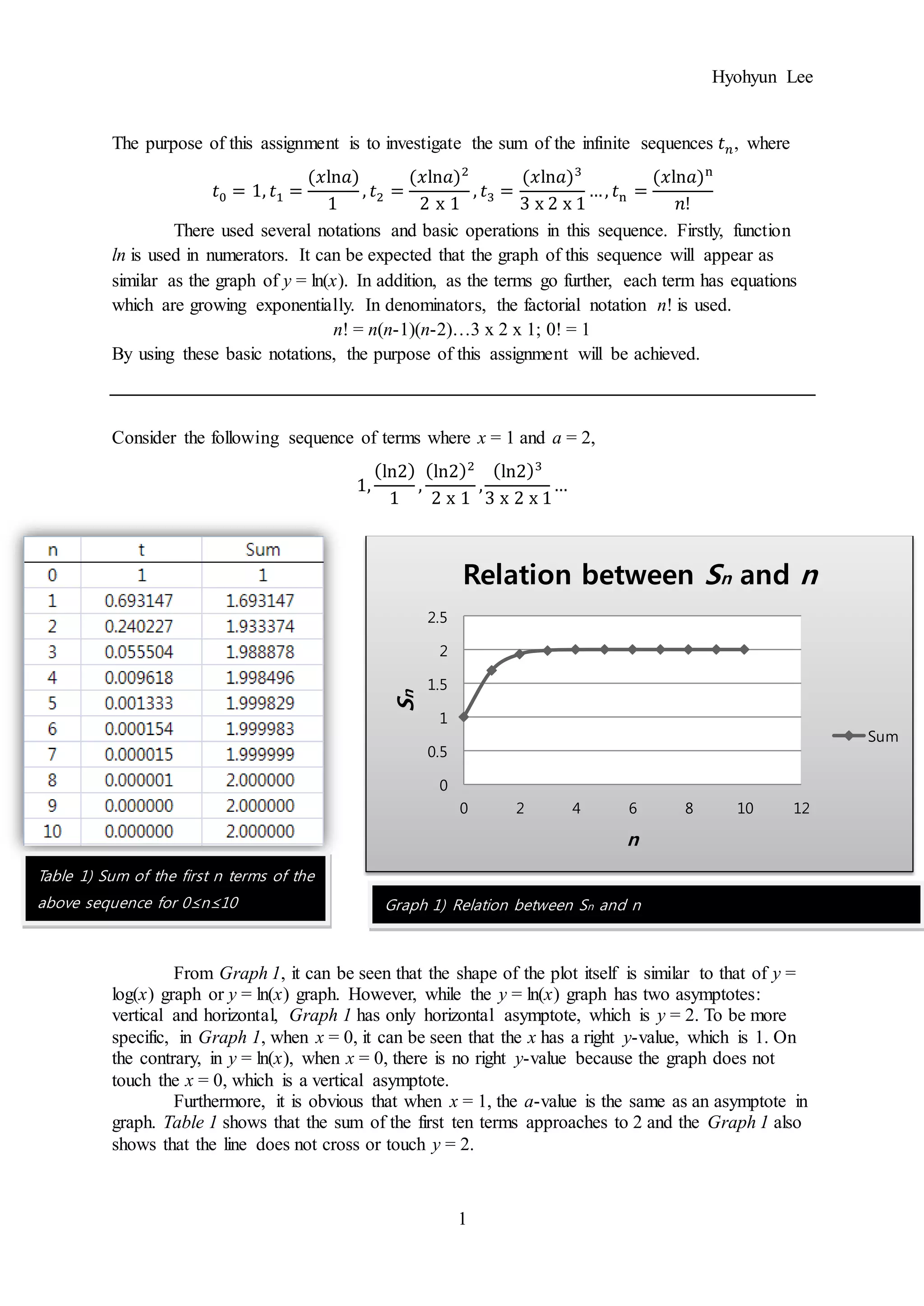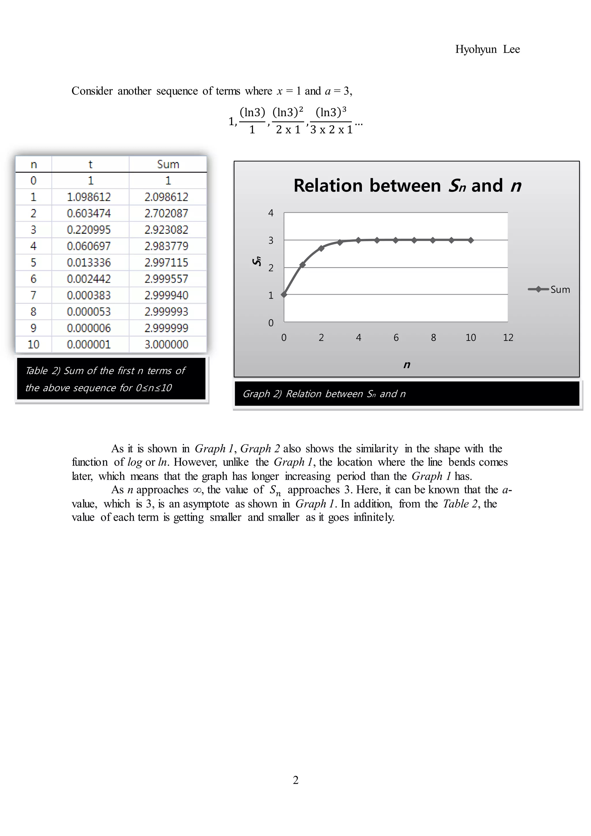 The document investigates an infinite sequence where terms are defined using natural logarithms and factorials. Six graphs are presented showing the relationship between the partial sum Sn and n for different values of variables a and x. The graphs demonstrate that as a increases, the increasing period at the beginning gets longer, and Sn approaches a as the asymptote. Further graphs show that for a fixed a, the shape of the graph becomes more exponential-like as x increases.