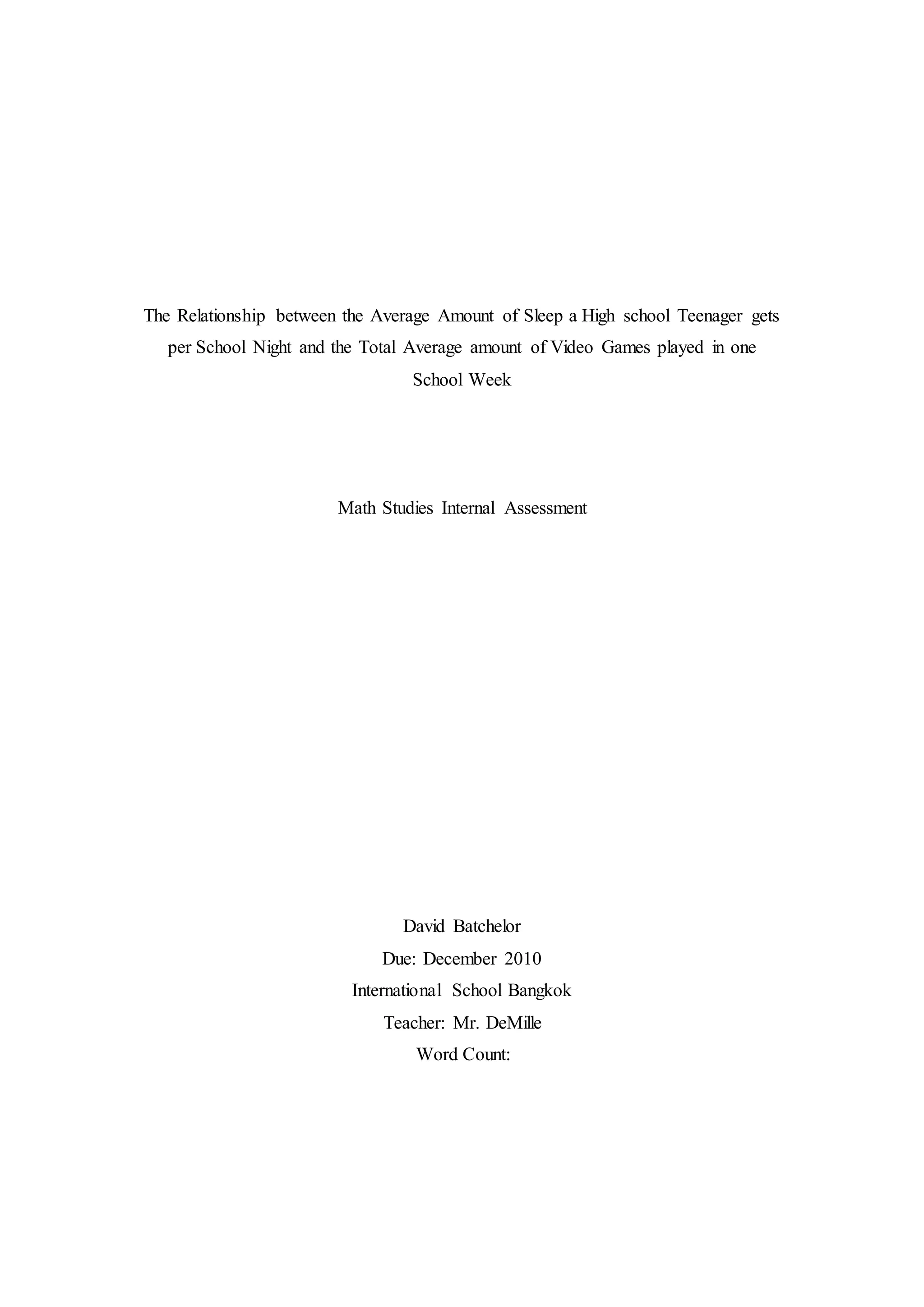 - The document analyzes the relationship between the average hours of video games played per school week and the average hours of sleep per school night for 50 high school students.