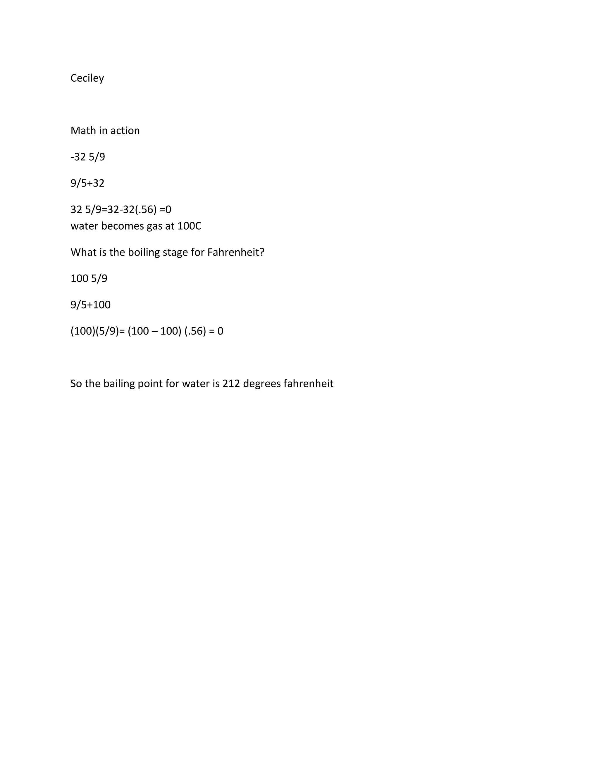 The document shows calculations to convert between Celsius and Fahrenheit for the boiling point of water. It first calculates that water boils at 100 degrees Celsius, then performs the conversion to find that water boils at 212 degrees Fahrenheit. The boiling point marks the stage where water becomes gas.