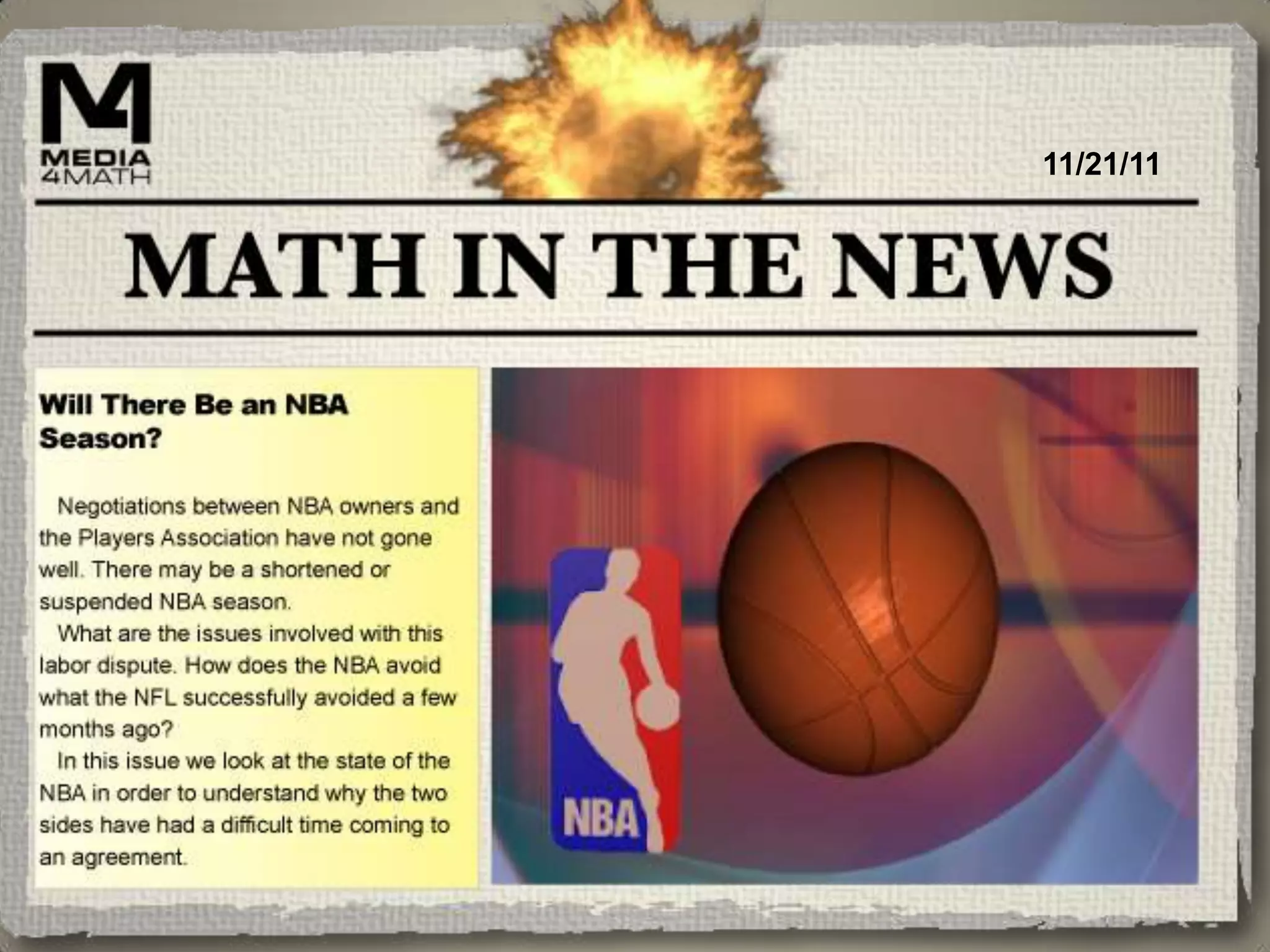 The NBA is facing uncertainty about the upcoming season due to a labor dispute between owners and players over a new collective bargaining agreement, potentially delaying games until mid-December. Financial analysis shows a steady increase in revenues over the years, although recent seasons have shown flat revenue and declining profitability, resulting in cut expenses. This differs from the NFL's situation, where the challenge was previously about dividing a growing revenue stream rather than a shrinking one.