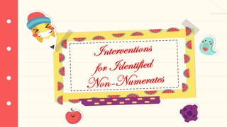 The document contains data from pre- and post-tests on students' numeracy skills. The pre-test showed that 18.46% of students were non-numerate, 52.33% were nearly numerate, and 29.21% were numerate. The post-test after programs found those percentages reduced to 6.96%, 47.72%, and 45.33%, respectively, showing an increase in numerate students. It then outlines five programs aimed at improving numeracy: Project PAMANA worked with parents on games, flashcards, and manipulatives; Project PLAY used interactive apps, online platforms, and videos; and OPLAN GIFTS provided incentives to students.