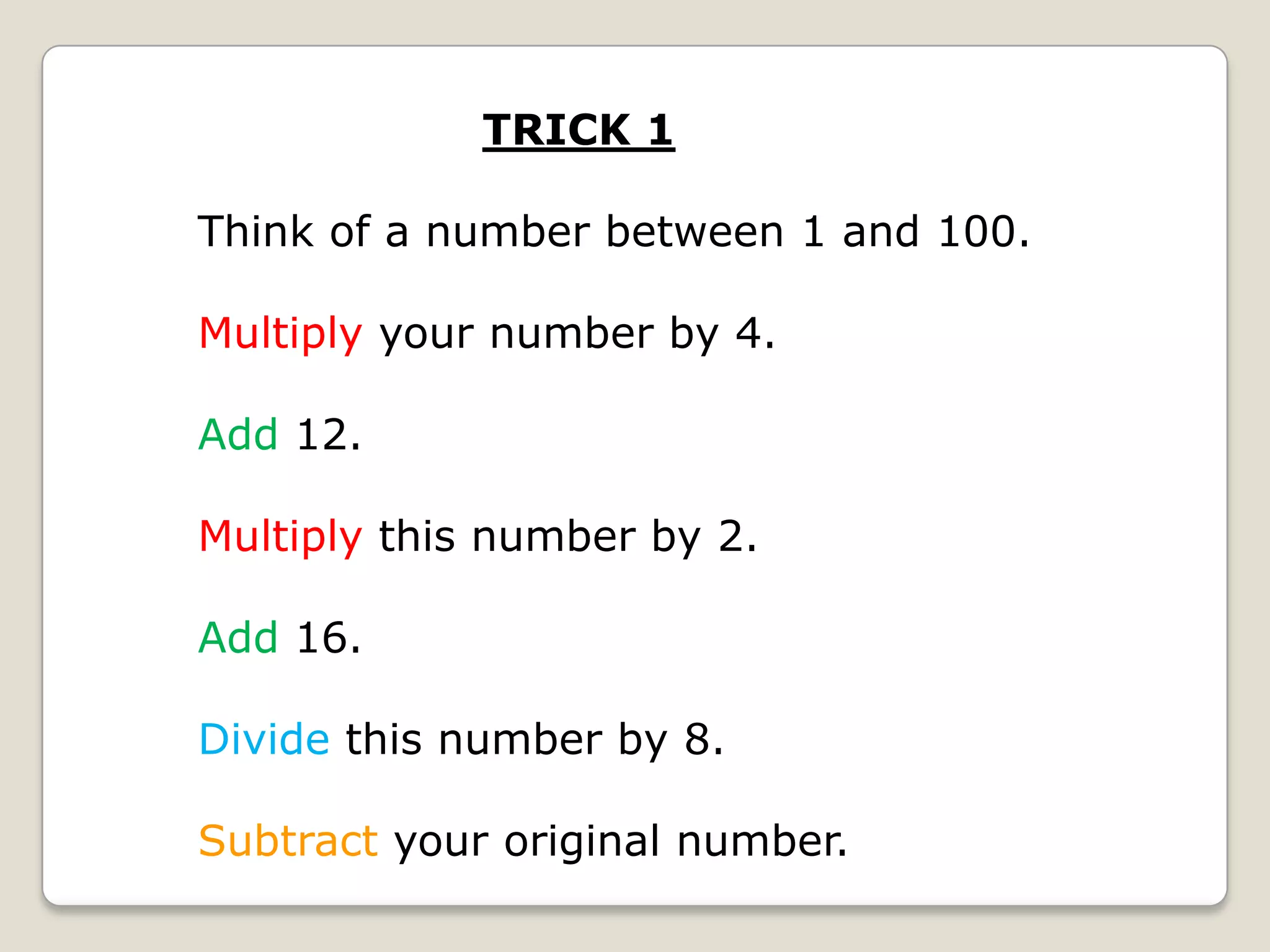 This document contains instructions for 6 math tricks or magic tricks involving numbers. Each trick provides step-by-step instructions for manipulating one or more numbers through operations like multiplication, addition, subtraction, and changing digits to arrive at a final number or result. The tricks are intended to surprise the reader by connecting a starting number they choose to a given ending number.