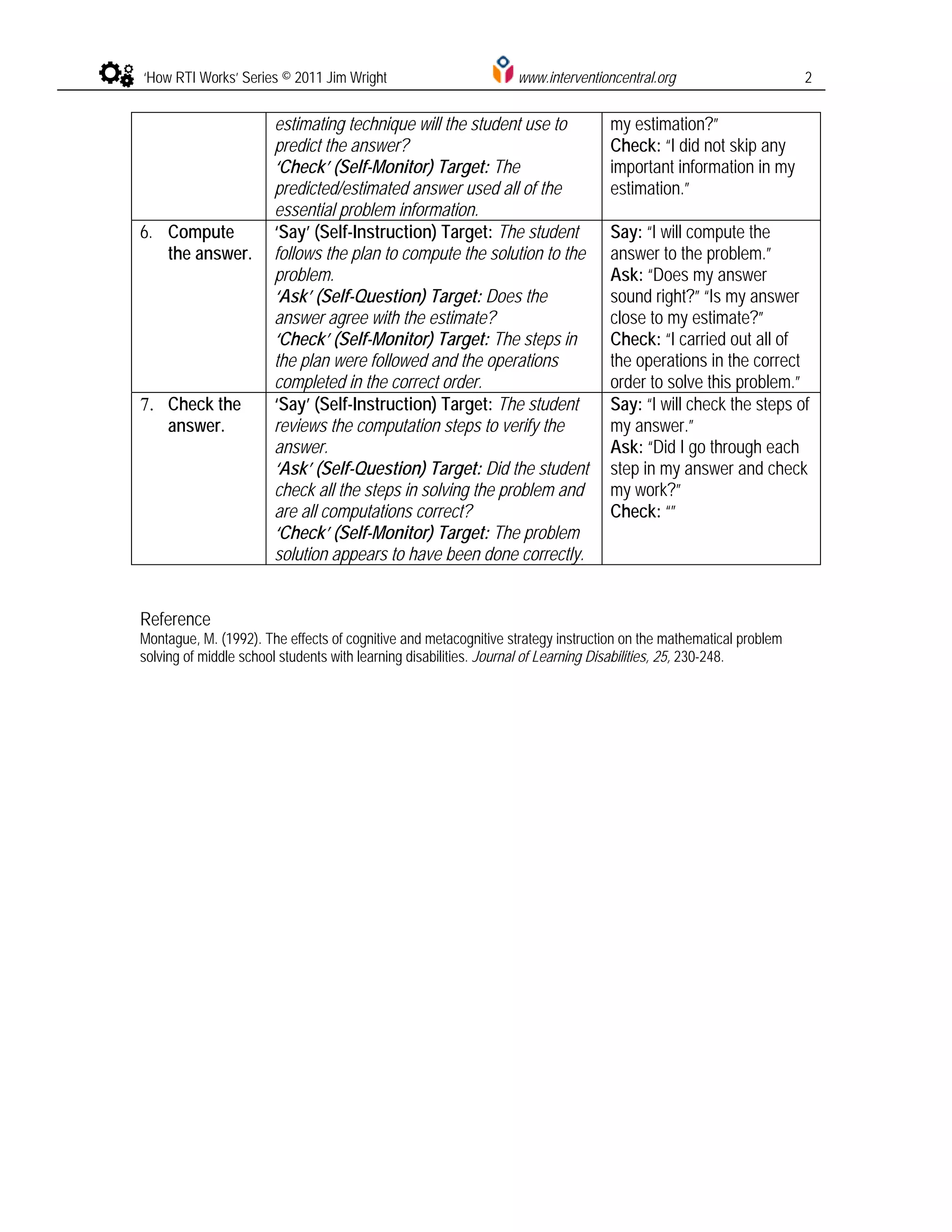 This document describes a cognitive strategy called "Say-Ask-Check" that uses metacognitive prompts to help students solve word problems in math. The strategy involves 7 steps: 1) read the problem, 2) paraphrase the problem, 3) draw the problem, 4) create a plan to solve the problem, 5) predict/estimate the answer, 6) compute the answer, and 7) check the answer. At each step, students are prompted to "Say" what they will do, "Ask" themselves a question, and "Check" their work or understanding. The goal is to help students monitor their own problem solving and comprehension.