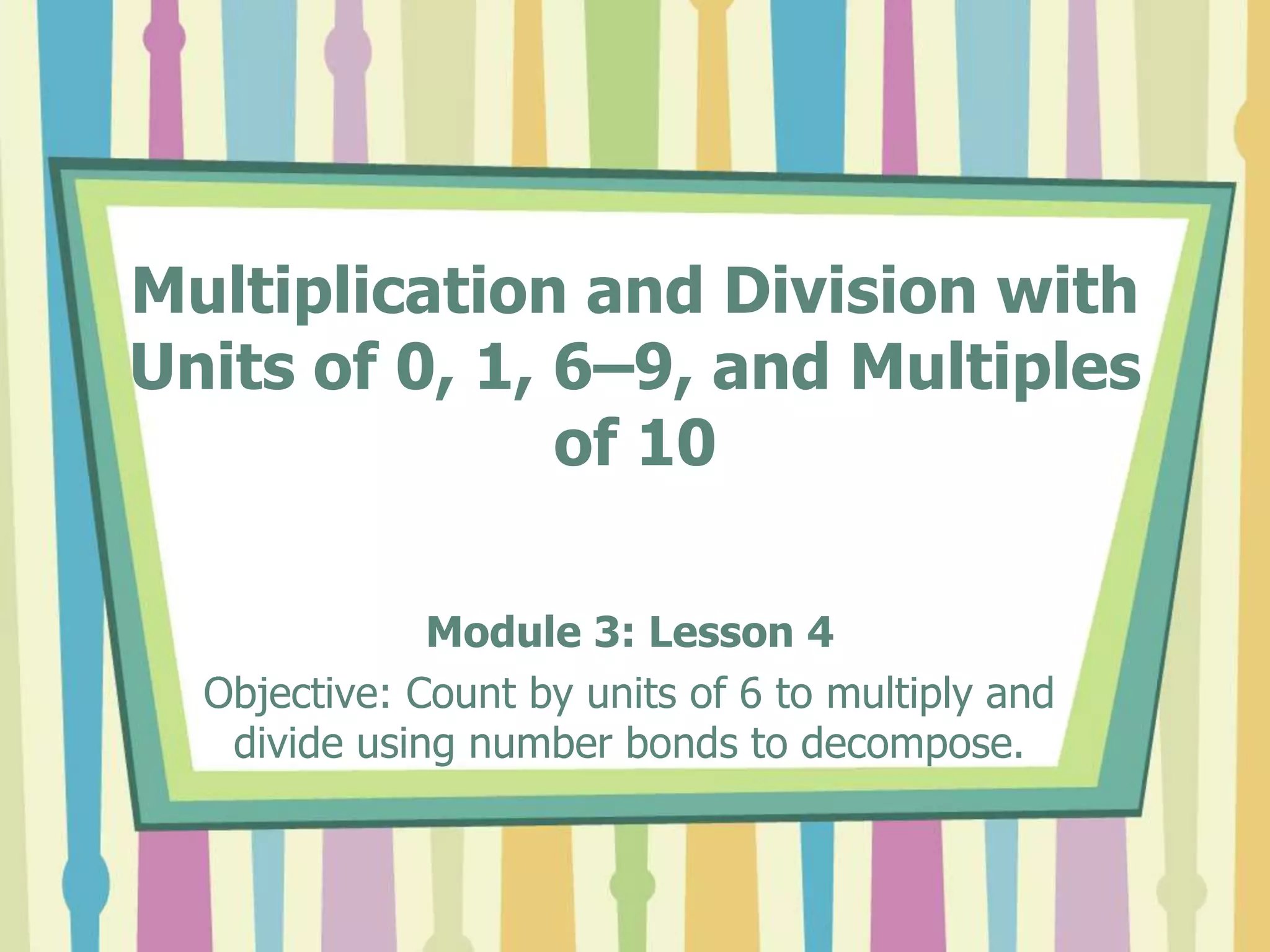 This document outlines a math lesson on multiplying and dividing by units of 6-9 and multiples of 10. The lesson includes group counting, familiar multiplication and division facts practice, using arrays and the distributive property to multiply, a "Make Ten" card game, an application problem about putting pictures in a photo album, and a concept development on using number bonds and skip-counting by 6 to solve multiplication and division problems. Students will then complete a problem set, debrief, and exit ticket on the lesson content.