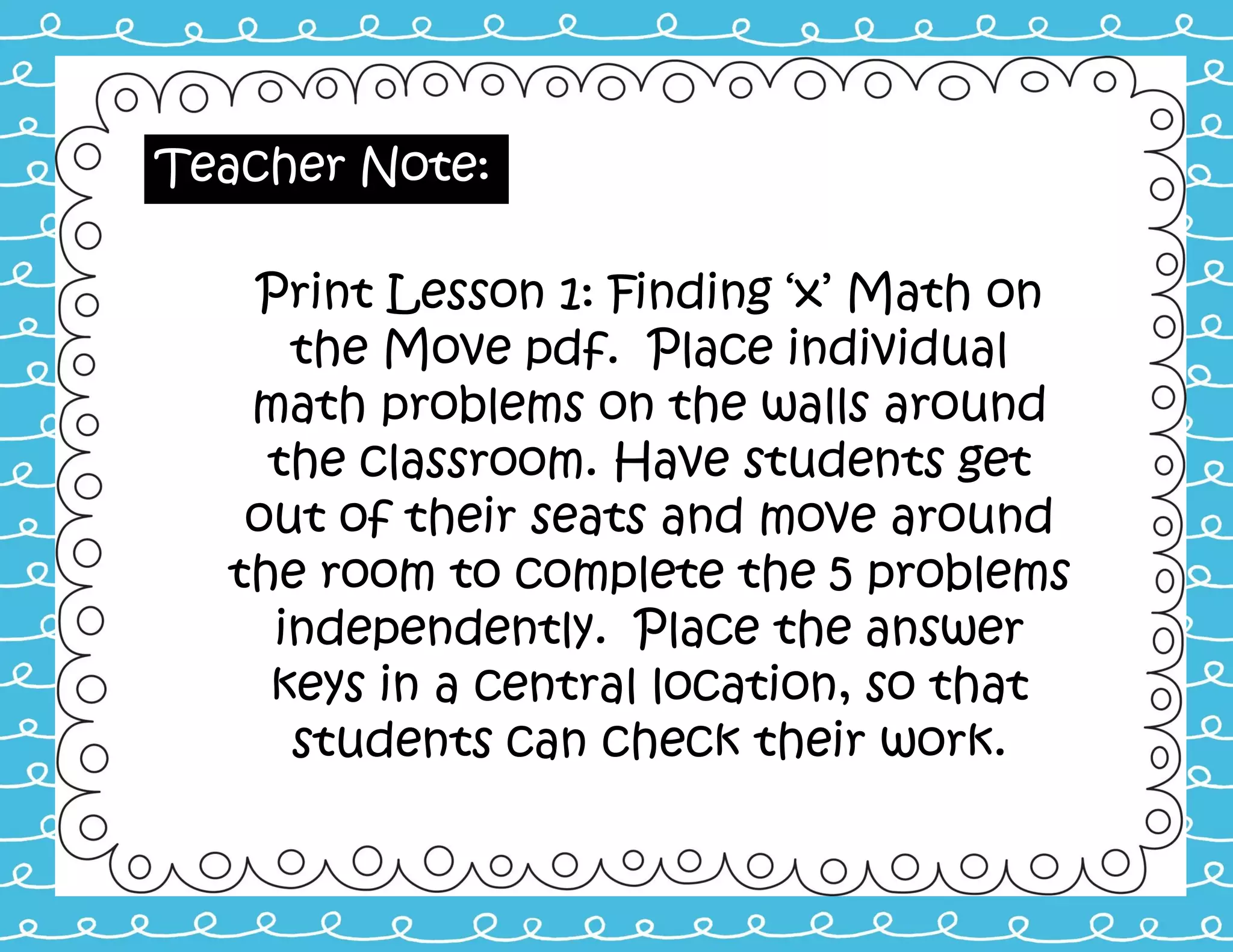 Students complete 5 math problems placed around the classroom independently and then check their work against answer keys in a central location. The practice problems include solving for the variable x in equations such as 15x + 12 = 25x - 8. A teacher thanks various teachers who created math products to help students succeed on standardized tests, noting this product should only be used in one classroom.