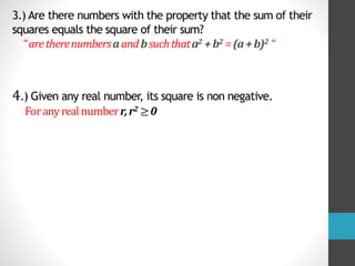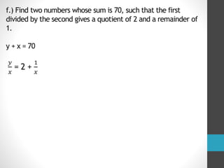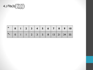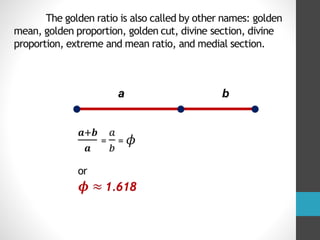 The document discusses Fibonacci numbers and the golden ratio, explaining how Fibonacci numbers are generated by summing the two preceding integers in the sequence starting from 0 and 1. It also describes the golden ratio as a mathematical concept where a line segment is proportionally divided and is often associated with aesthetic appeals in art and nature. Additionally, the document covers the use of variables in algebraic computations and provides examples of mathematical problems related to both Fibonacci numbers and the golden ratio.