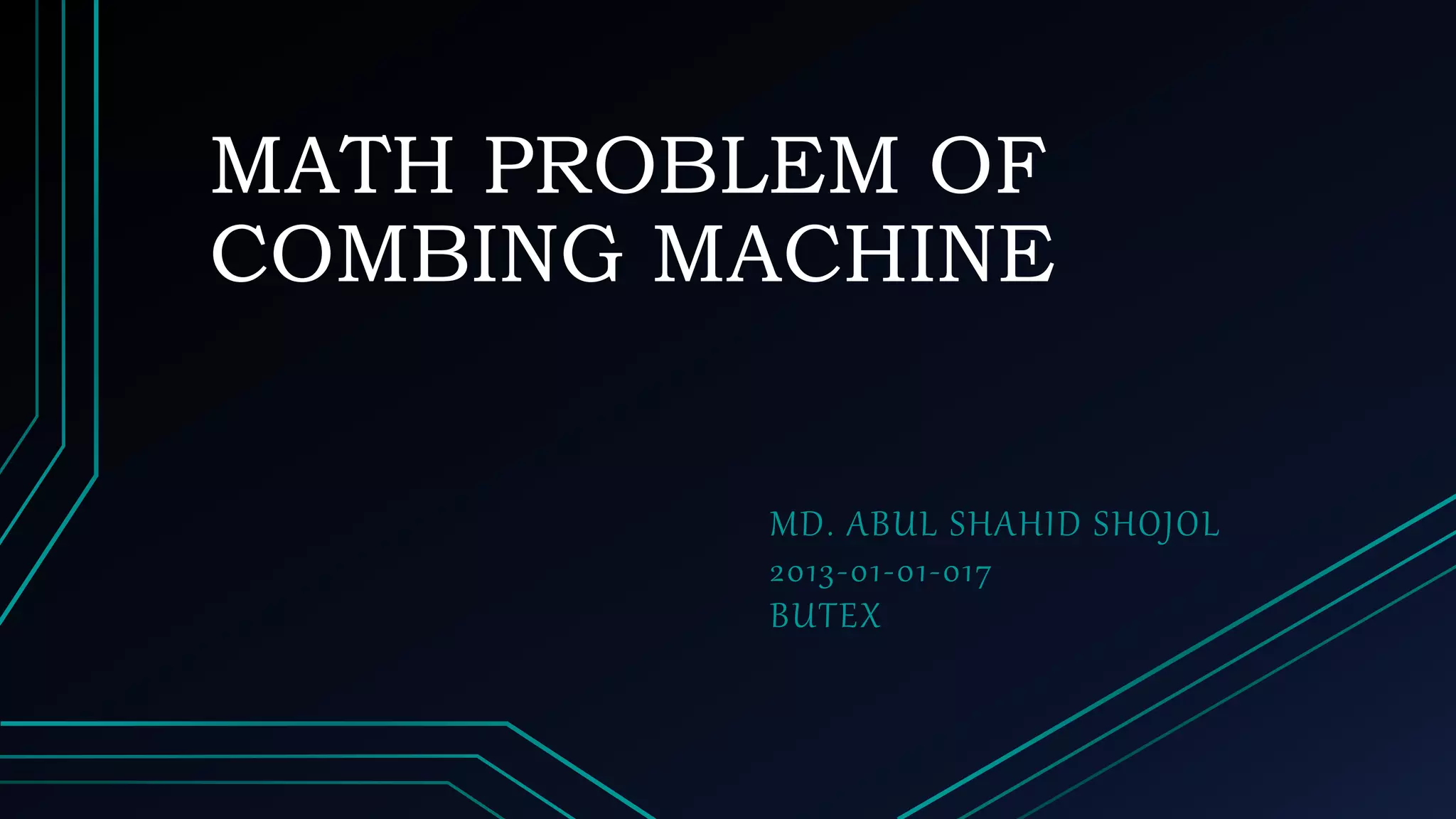 This document provides examples of math problems for calculating production rates and drafts for combing machines. It includes problems calculating production constants, production per shift, ribbon lap hanks, actual drafts given mechanical drafts and waste percentages, DCP from various combing machine parameters, total production given nip rate, head number, feed rate, efficiency and noil percentage, number of machines needed to produce a daily production amount, and finding drafts or DCPs given sliver hanks or required outputs. Solutions are provided for each example problem.
