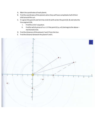 This document provides instructions for marking planet coordinates, finding halfway points in planetary orbits, determining circle equations and membership, and calculating distances between planets and from planets to the sun. Specifically, it instructs the user to: 1) mark planet coordinates and find halfway points in orbits; 2) determine the equation of a circle given its center and a point, and find values making a given point part of the circle; and 3) find distances of planets from the sun and between planets.