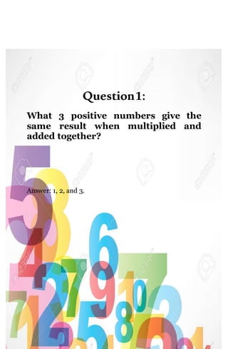 This document contains math riddles, trivia questions, jokes and information about mathematicians René Descartes, Adrien-Marie Legendre, Blaise Pascal, and Charles Hermite. It includes 3 riddles with answers, 3 trivia questions with answers, 2 jokes with answers, and biographies of the 4 mathematicians and their contributions to mathematics such as analytical geometry, least squares method, probability theory, and elliptic functions.