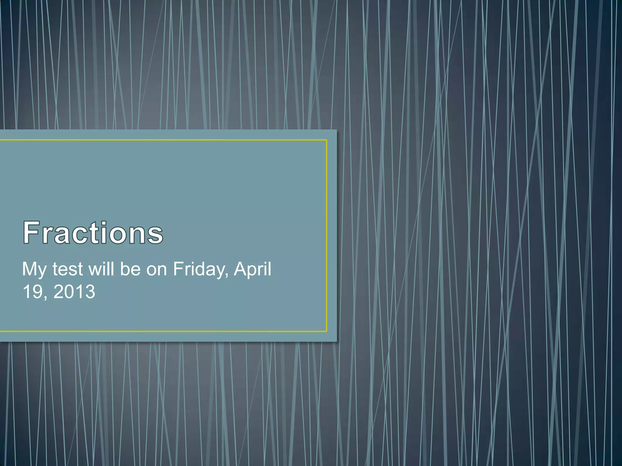 The document mentions that a test will be held on Friday, April 19th, 2013. It then discusses dividing something into fourths, stating that if something is divided into 4 equal parts, those 4 parts make up the whole amount.