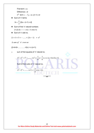 1. The document provides formulas and explanations for calculating averages, rates, speed, time, distance, ratios, percentages, and other concepts. It includes chapters on averages, compound interest, simple interest, boats and streams, HCF and LCM, time and distance, permutations and combinations, time and work, pipes and cisterns, mixtures and allegations, and partnerships.