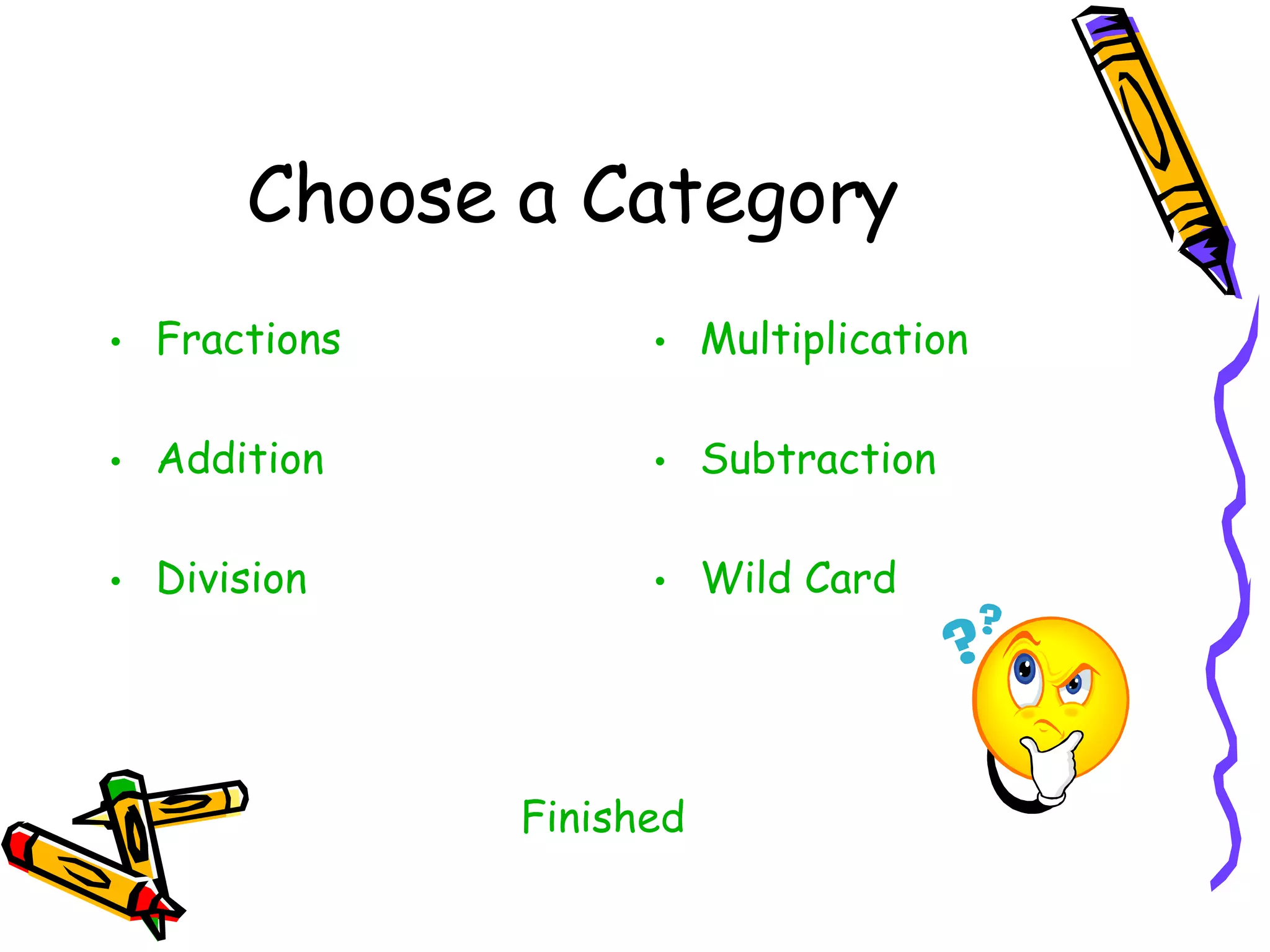 This document contains a math trivia quiz with multiple choice questions in categories like fractions, addition, division, multiplication, subtraction, and a wild card category. The quiz tests skills like dividing pies between people, doubling recipes, adding multiple numbers, dividing numbers, multiplying one and two-digit numbers, subtracting larger numbers, and identifying right triangles and calculating area of a shape. The document provides the questions, multiple choice answers to select from, and then reveals the correct answers. It congratulates the player at the end for completing the quiz.