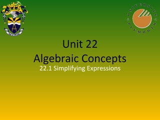This document outlines 8 presentations covering algebraic concepts taught in Unit 22. The presentations include simplifying expressions, solving simple and linear equations, equations in context, algebraic manipulation, and algebraic fractions. Each presentation provides example problems and solutions to illustrate the concepts and skills covered.