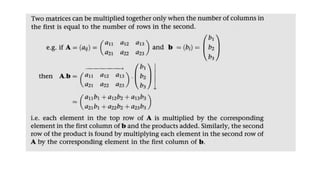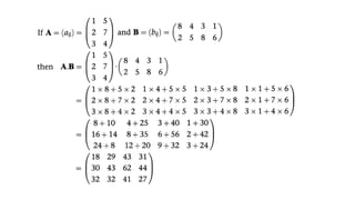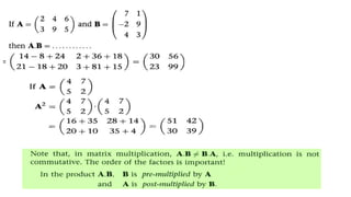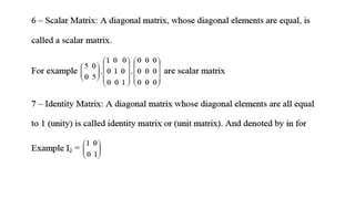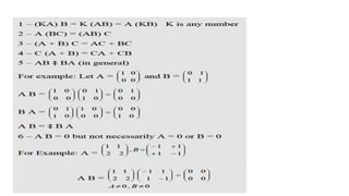 1. The document discusses matrices, including definitions, types of matrices, operations on matrices such as addition, subtraction, multiplication, and properties of these operations.