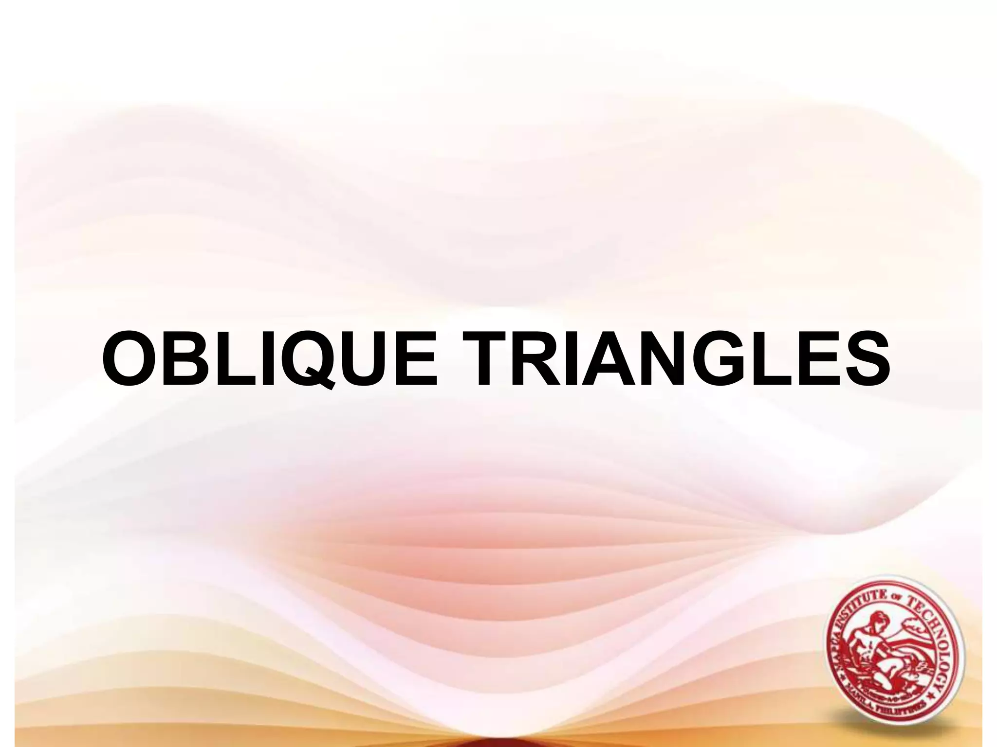 The document derives the Law of Sines and Law of Cosines, which relate the angles and sides of triangles. It discusses using these laws to solve oblique triangles given certain information like two angles and a side, two sides and the angle opposite one of the sides, two sides and the angle between them, or all three sides. It also covers finding the area of a triangle given two sides and the included angle, or using Heron's Formula with all three sides. Application problems demonstrate using these concepts to solve real-world geometry problems.