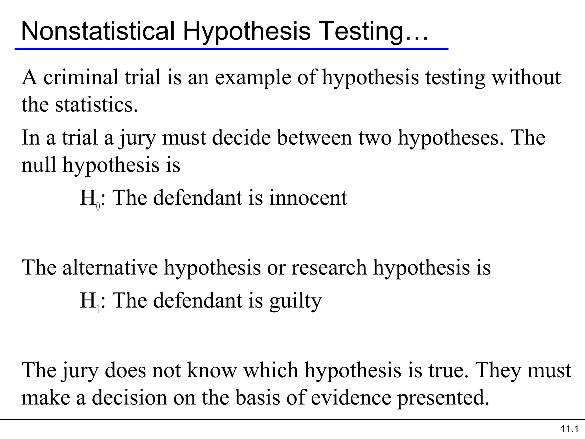 This document discusses hypothesis testing without statistics using a criminal trial as an example. It explains that in a trial, the jury must decide between a null hypothesis (H0) that the defendant is innocent, and an alternative hypothesis (H1) that the defendant is guilty based on the presented evidence. There are two possible errors - a Type I error of convicting an innocent person, and a Type II error of acquitting a guilty person. The probability of each error is inversely related to the sample size. The document provides examples to illustrate hypothesis testing concepts like rejection regions, test statistics, and interpreting p-values.