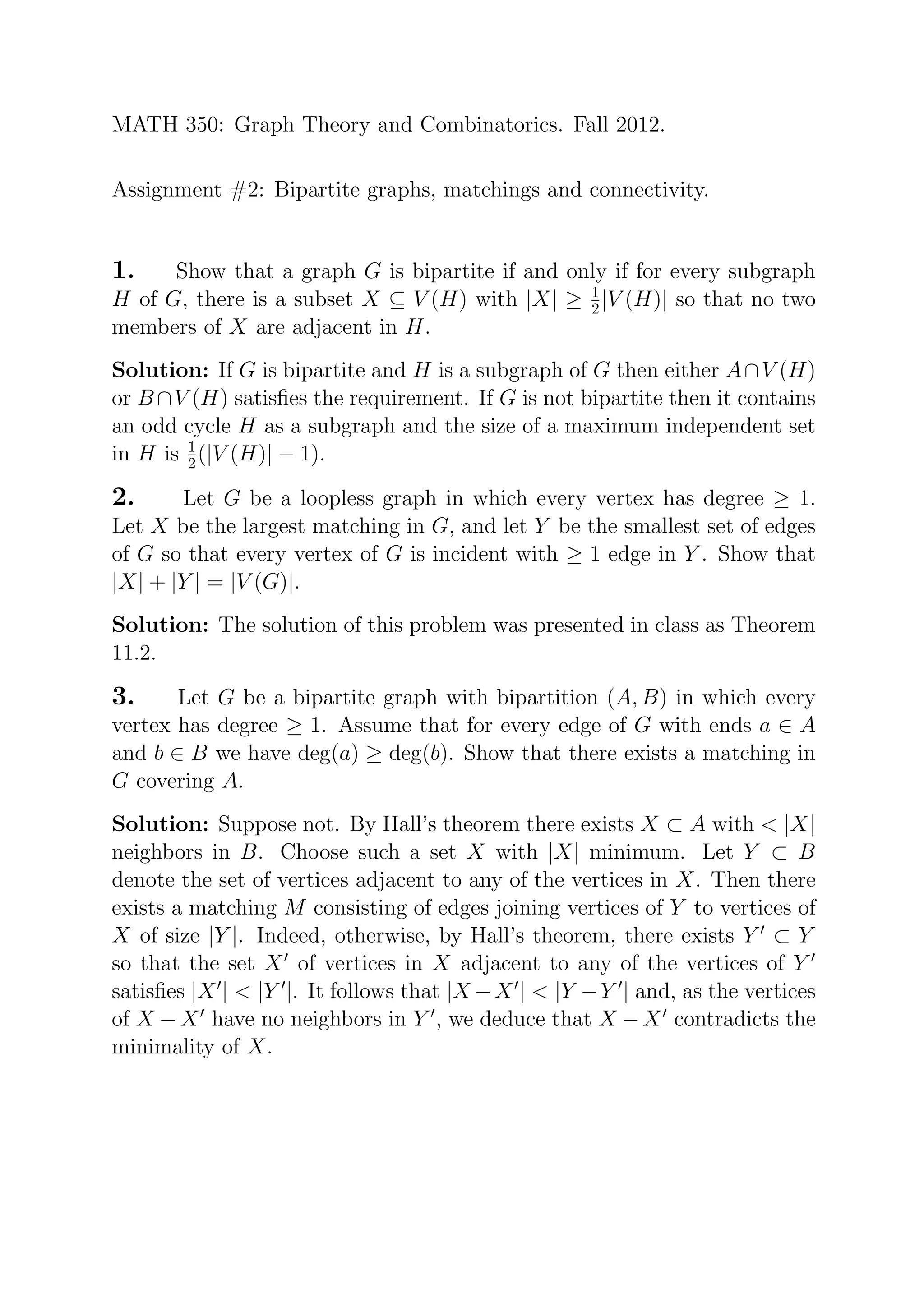 This document contains solutions to problems in graph theory and combinatorics from a course assignment. It addresses questions about bipartite graphs, matchings, connectivity, and more. The problems cover topics like showing a graph is bipartite based on independent sets, determining the size of maximum matchings, existence of matchings covering subsets of vertices, and conditions for when edges lie on common cycles. Counterexamples are provided for some statements about linking and joining vertices and subsets.