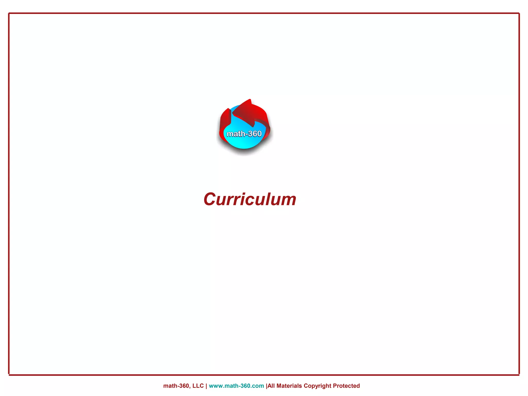 The document outlines the comprehensive math curriculum provided by Math-360, LLC, covering grades 1 to 5. It includes topics such as numbers, addition, subtraction, geometry, measurement, patterns, and money handling, detailing specific learning objectives and content coverage for each grade level. The curriculum emphasizes foundational skills in mathematics through progressive complexity in concepts and operations.