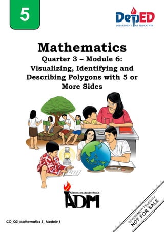 This document is a self-learning module for Grade 5 mathematics, specifically focusing on visualizing, identifying, and describing polygons with five or more sides. It provides an introduction, detailed lessons, and activities to enhance understanding of polygons, including their properties and classifications. Additionally, the module includes assessments and answer keys for self-checking to support home-based learning.