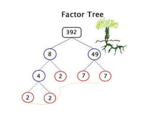This document discusses factors, division, and prime numbers. It provides examples of dividing numbers and determining factors. A number is prime if it has only two factors - 1 and itself. The document also introduces the concepts of greatest common divisor (GCD) and least common multiple (LCM), providing examples of finding the GCD and LCM of pairs of numbers. Exercises are included for readers to find the GCD and LCM of additional number pairs.