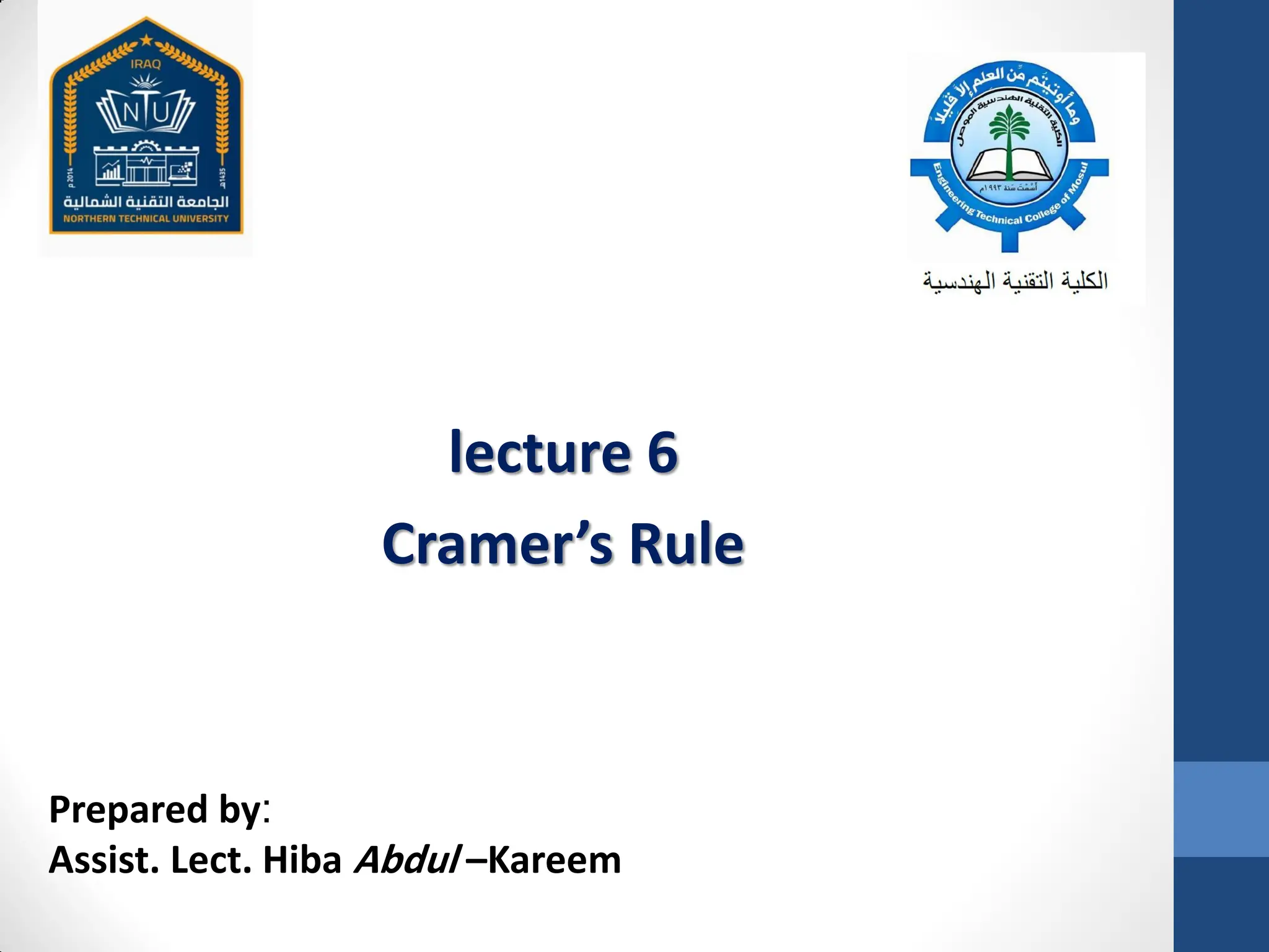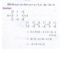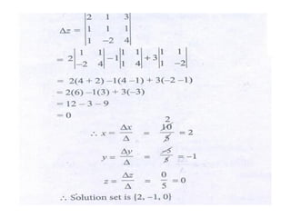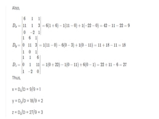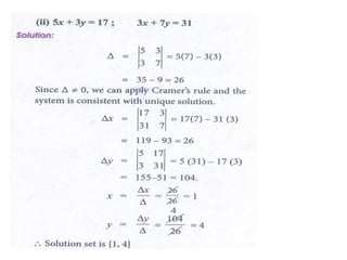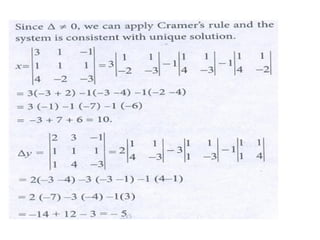 Cramer's rule is a method for solving systems of linear equations. It involves calculating the determinants of matrices. For a system of n variables (x1, x2, ..., xn) written in matrix form AX = B, the value of each variable is calculated as the determinant of the coefficient matrix with one column replaced by the constants column, divided by the determinant of the coefficient matrix. For a 2x2 system, Cramer's rule involves calculating the determinants D, Dx1, and Dx2. For a 3x3 system, the determinants are D, Dx1, Dx2, and Dx3. An example of applying Cramer's rule to a 2x