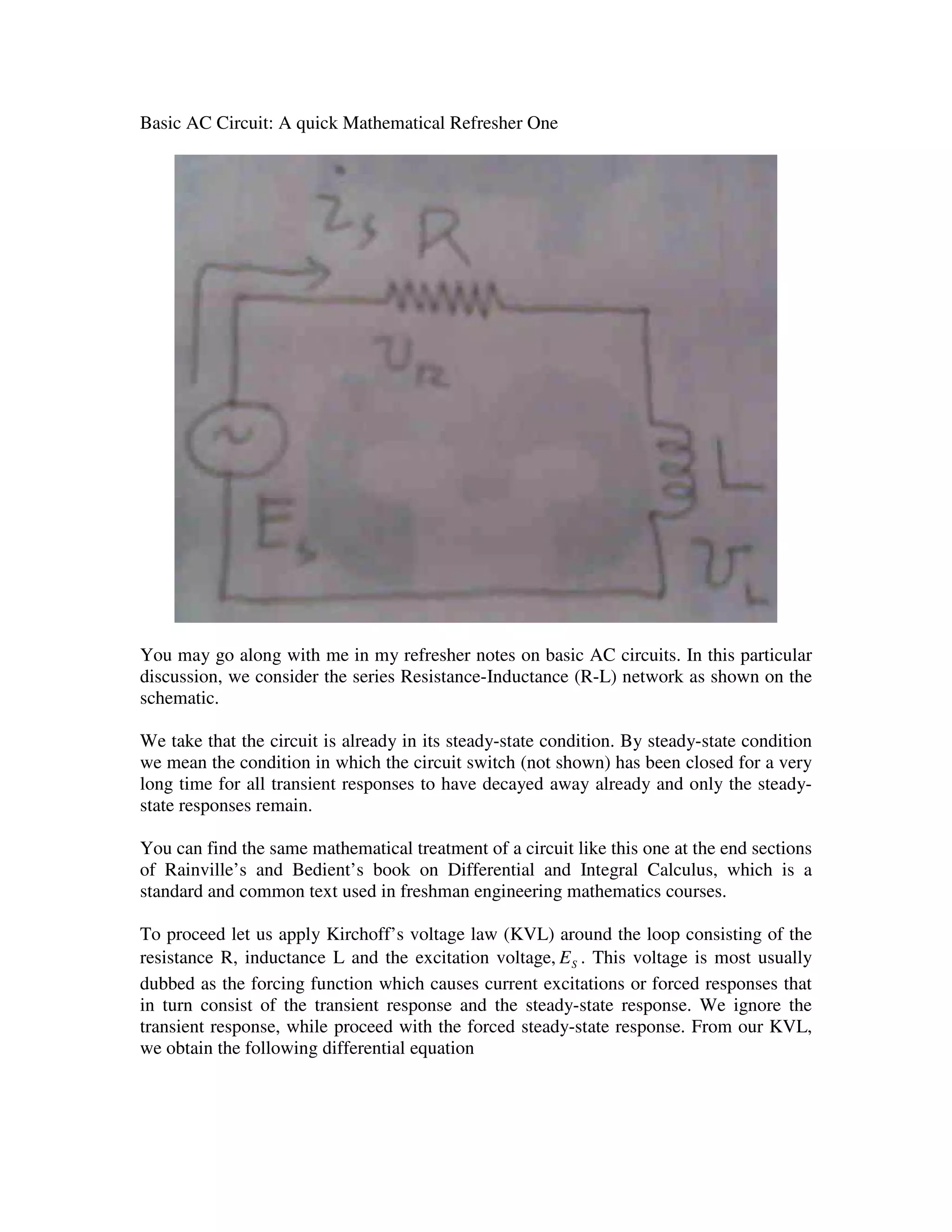 1) The document discusses the mathematical analysis of a basic AC circuit consisting of a resistor and inductor connected in series and driven by an external sinusoidal voltage source.