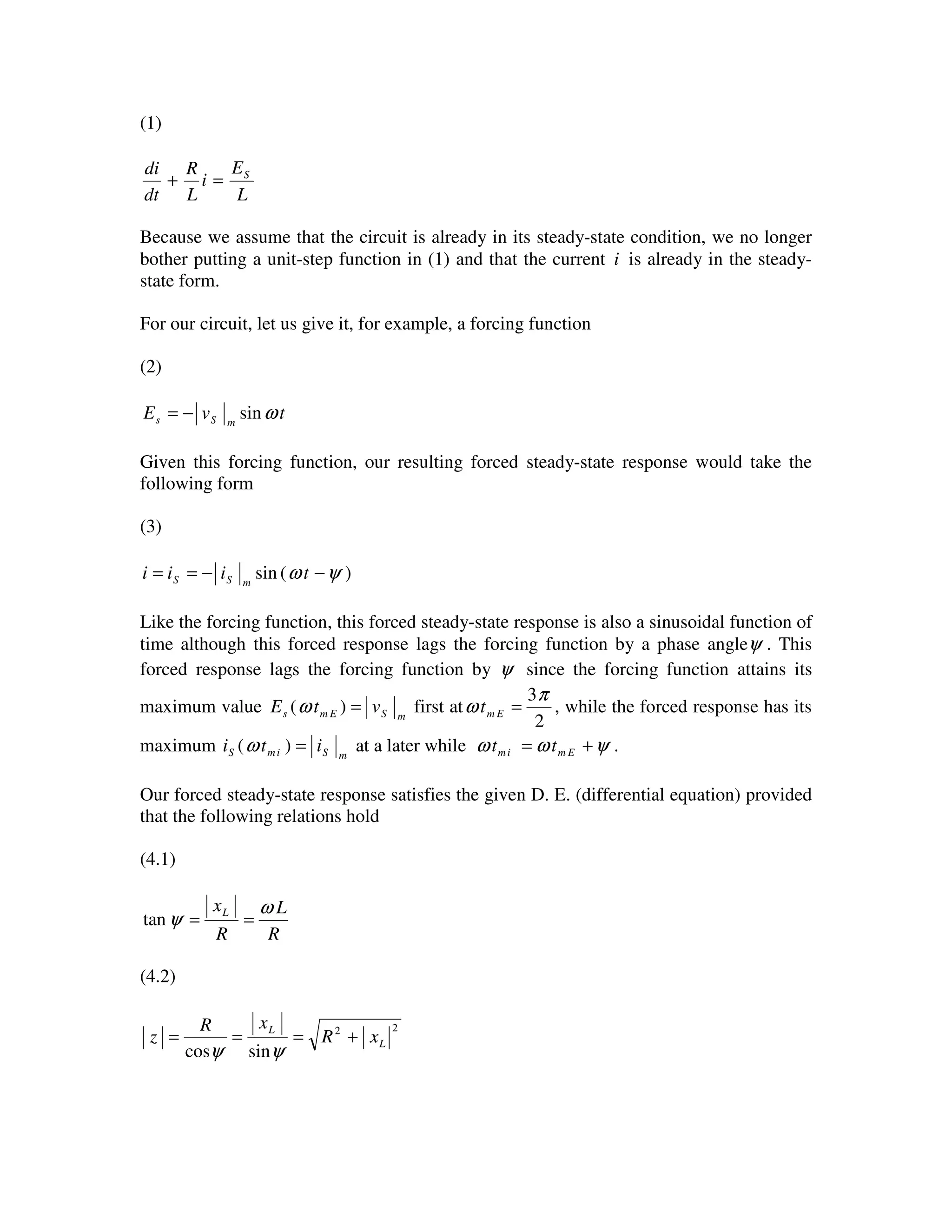 2) Kirchhoff's voltage law is applied to derive the differential equation governing the circuit and the forced steady-state response is shown to be a sinusoidal current lagging the driving voltage by a phase angle.