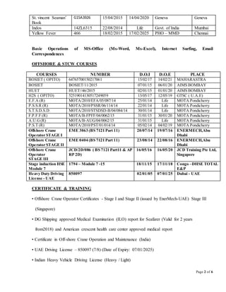 Mathan Kumar Corera is an experienced crane operator with over 17 years of experience and certifications up to stage III for offshore crane operations. He is seeking further opportunities to utilize his skills while contributing to business growth and his career. Corera is fluent in multiple languages and holds various relevant safety and technical certifications.