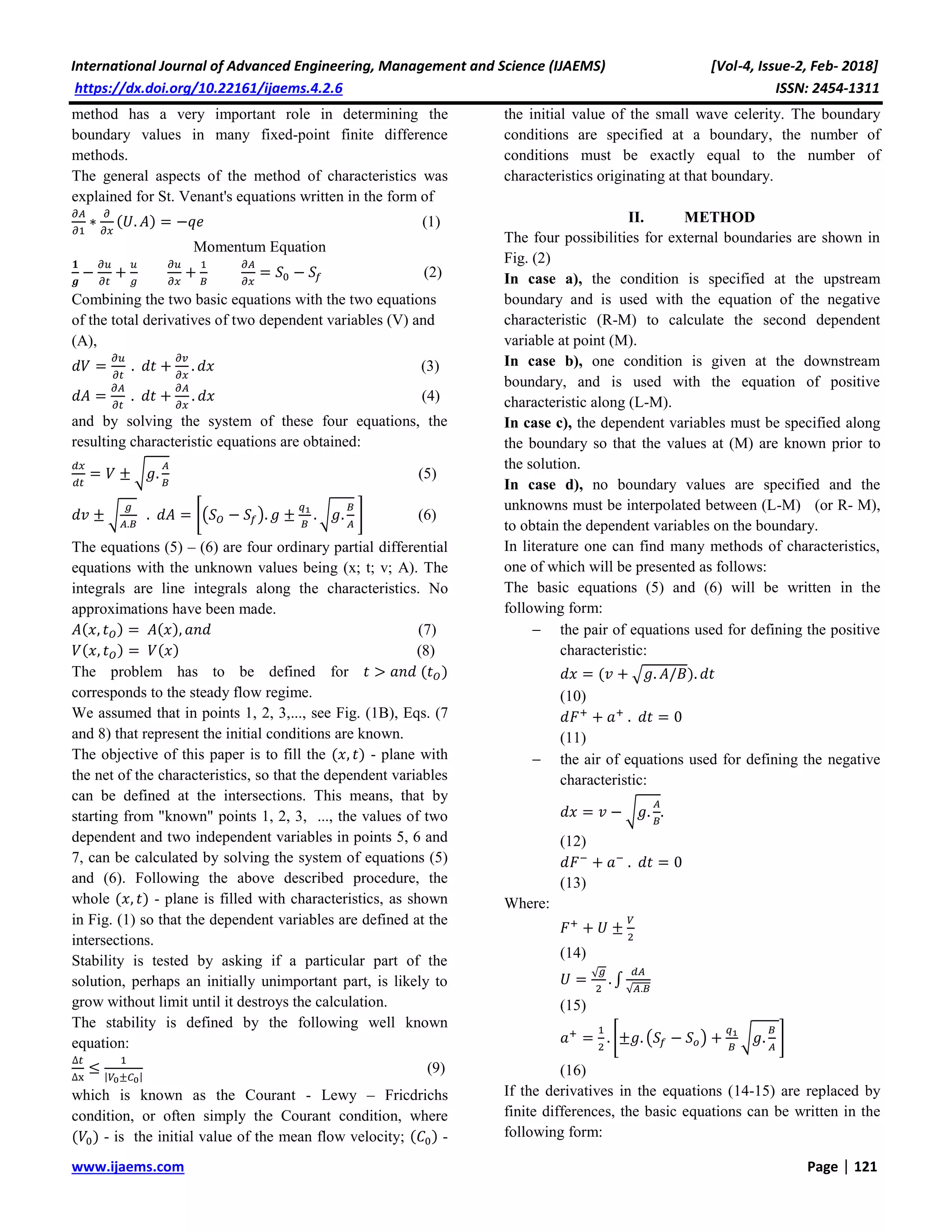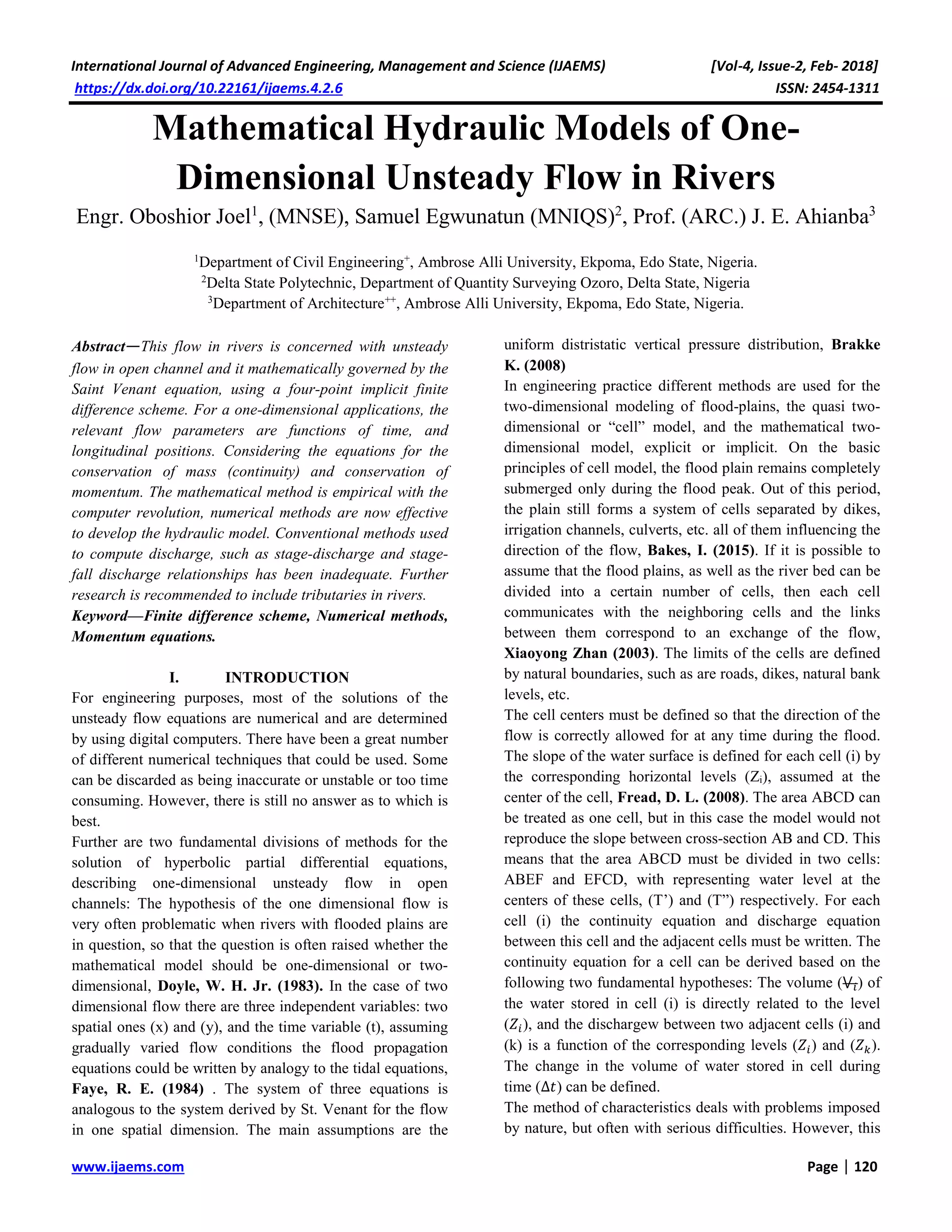 This document summarizes a mathematical hydraulic model for one-dimensional unsteady river flow. It begins by introducing the Saint Venant equations that govern such flow and numerical solution methods. It then discusses the finite difference method used, involving implicit and explicit schemes on a fixed grid to solve the equations of motion at discrete points. Stability criteria for the methods are also covered. The document provides background on numerical hydraulic modeling techniques for simulating unsteady river flow.